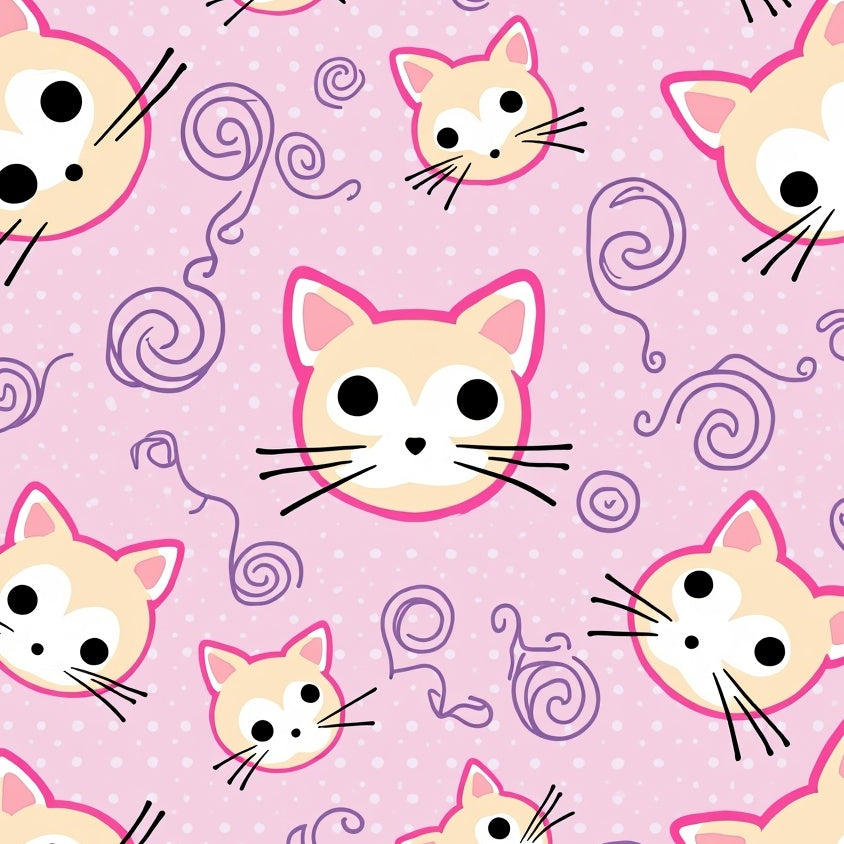 Charming Cartoon Cat Faces with Polka Dot Background and Swirling Vines(Pink)