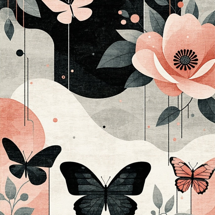 Chic Flower Fantasy Area with Abstract Insect Silhouettes and Boho Flourish(Gray)