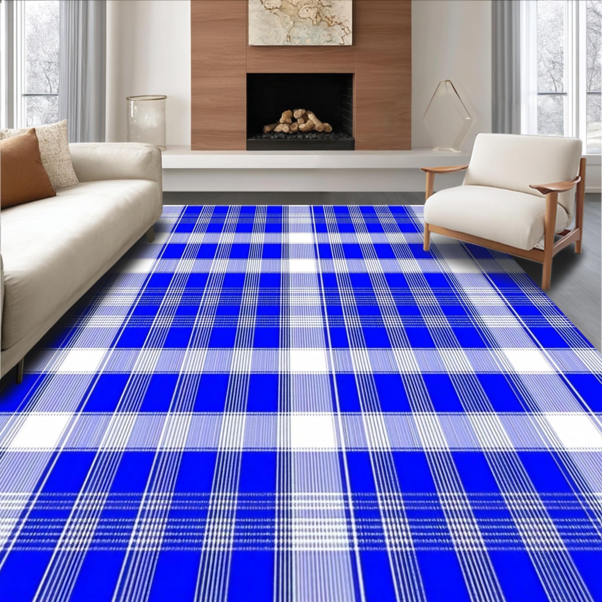 Contemporary Blue Checkered Rug Featuring Crisp Off White Grid Lines(Blue)