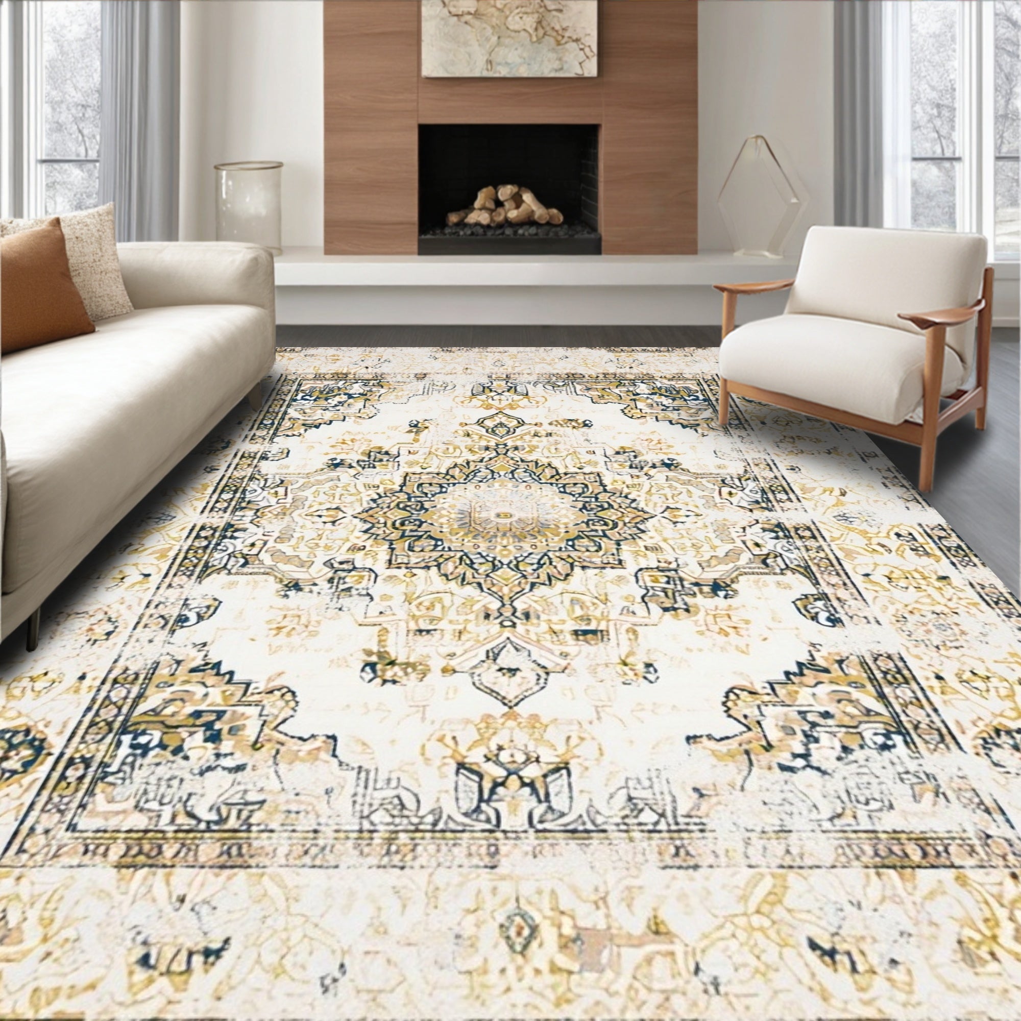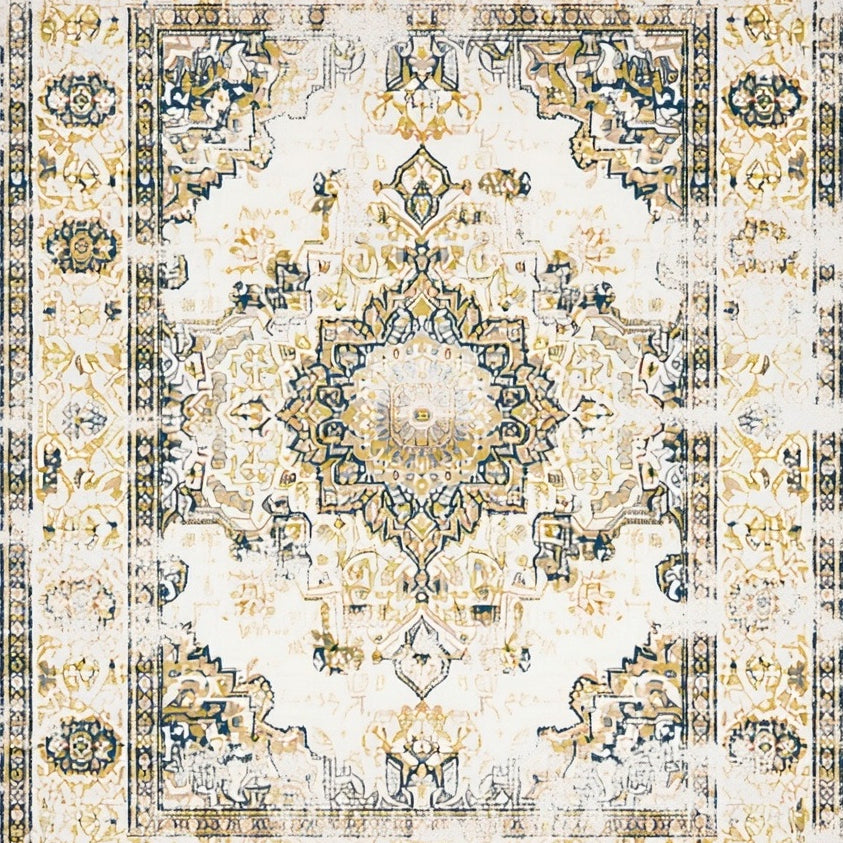 Distressed Area Low Pile Vintage Medallion Floor Beige(Ivory)