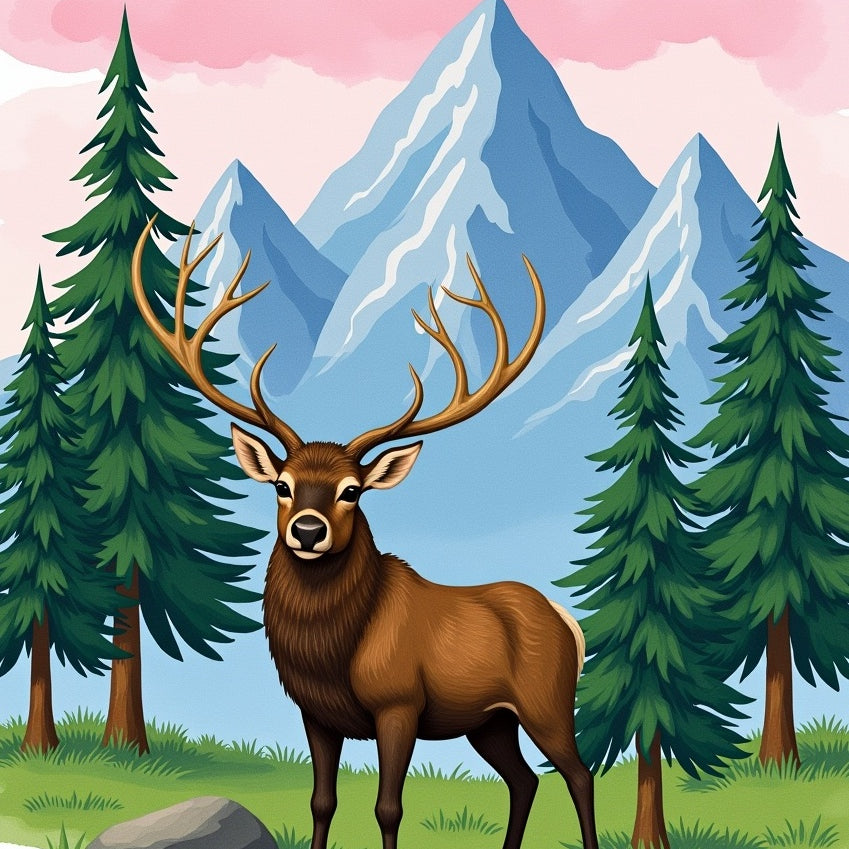 Dreamy Mountain Elk Pine Tree Landscape Floor(Brown)