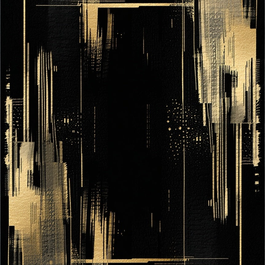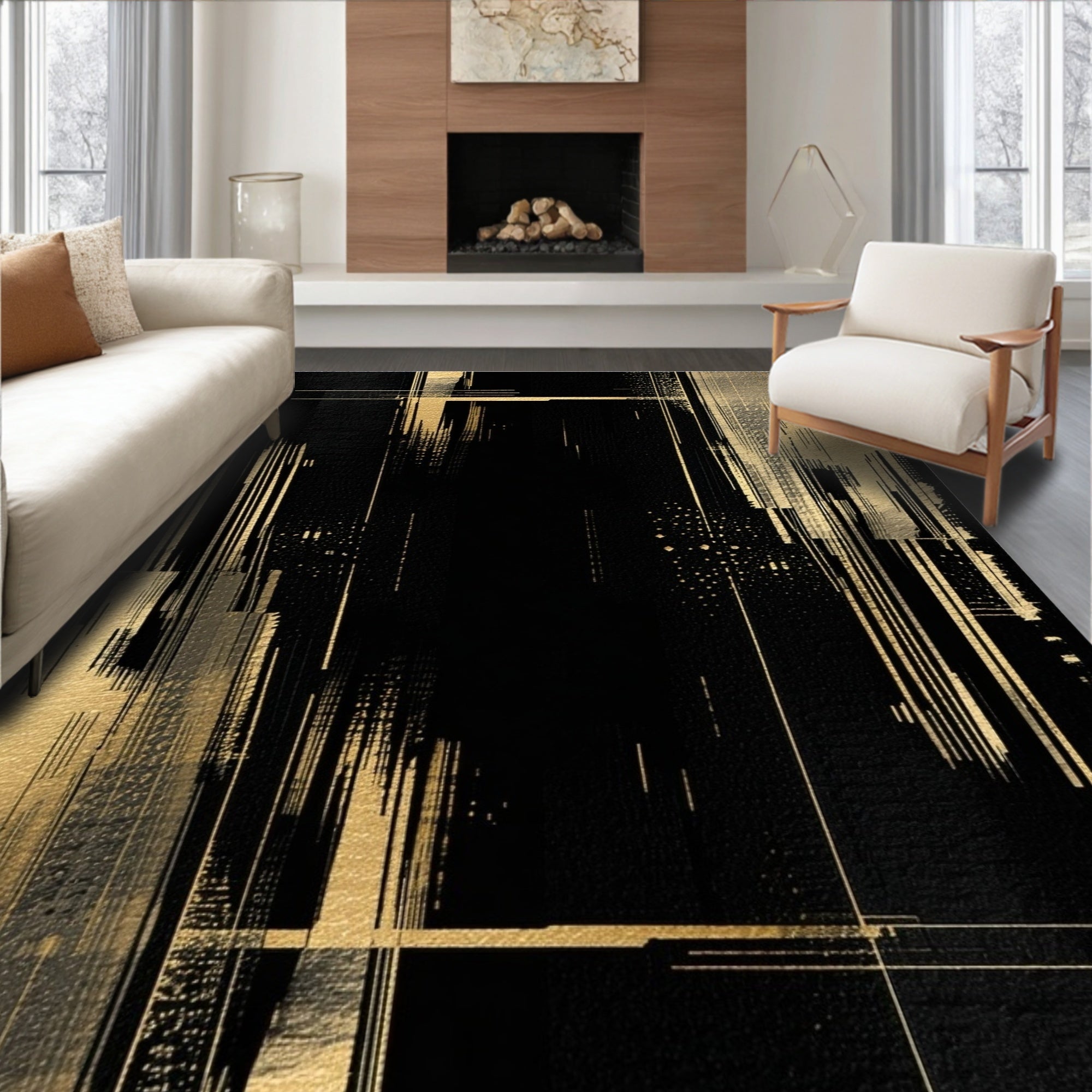 Elegant Black Rug with Gold Brushstroke Pattern and Metallic Highlights(Black)