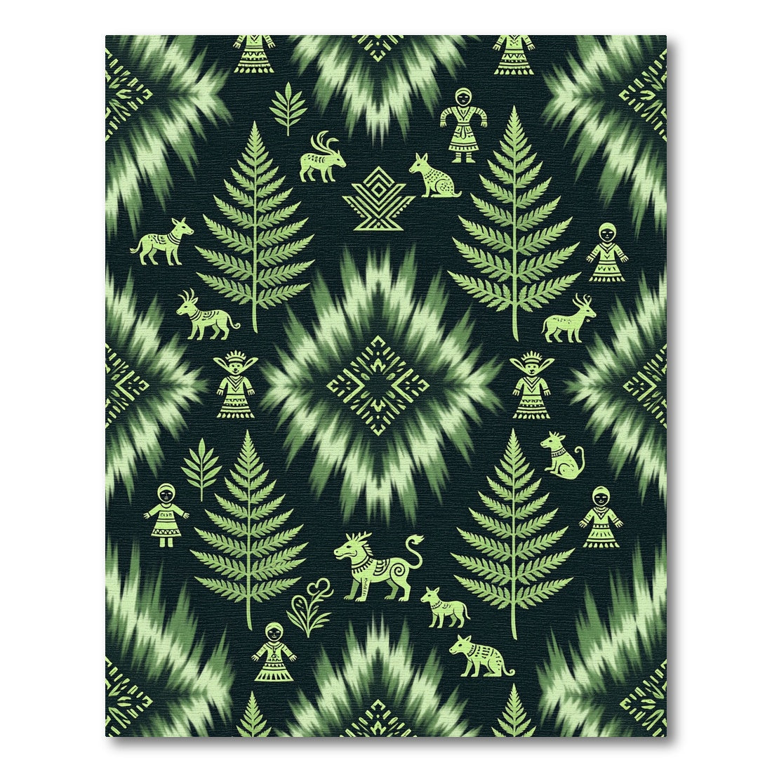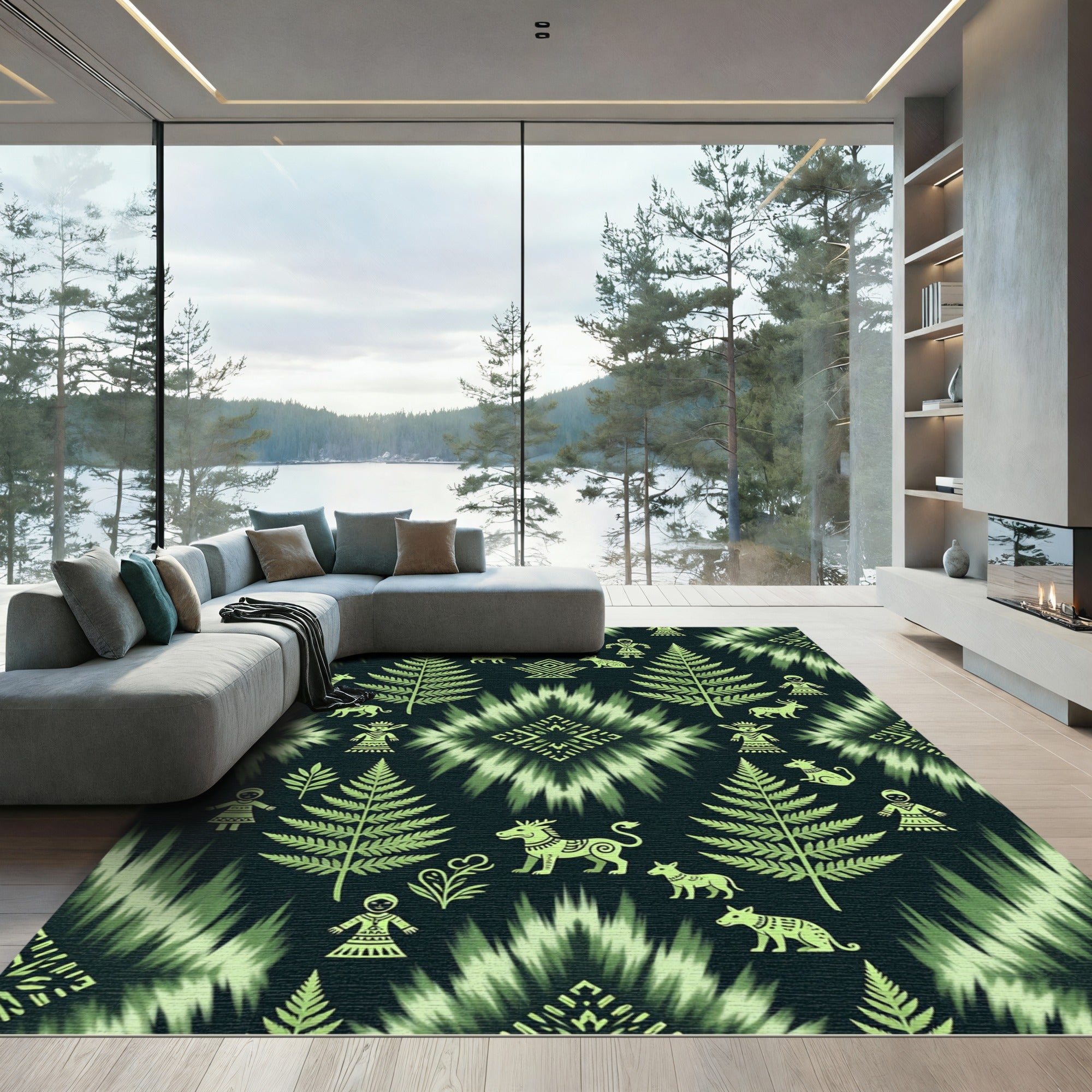 Folk Green Fern Animal People Medallion Rug