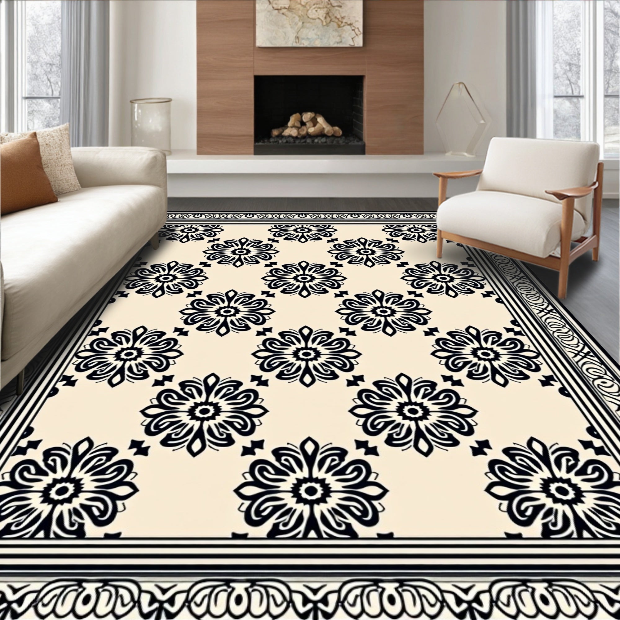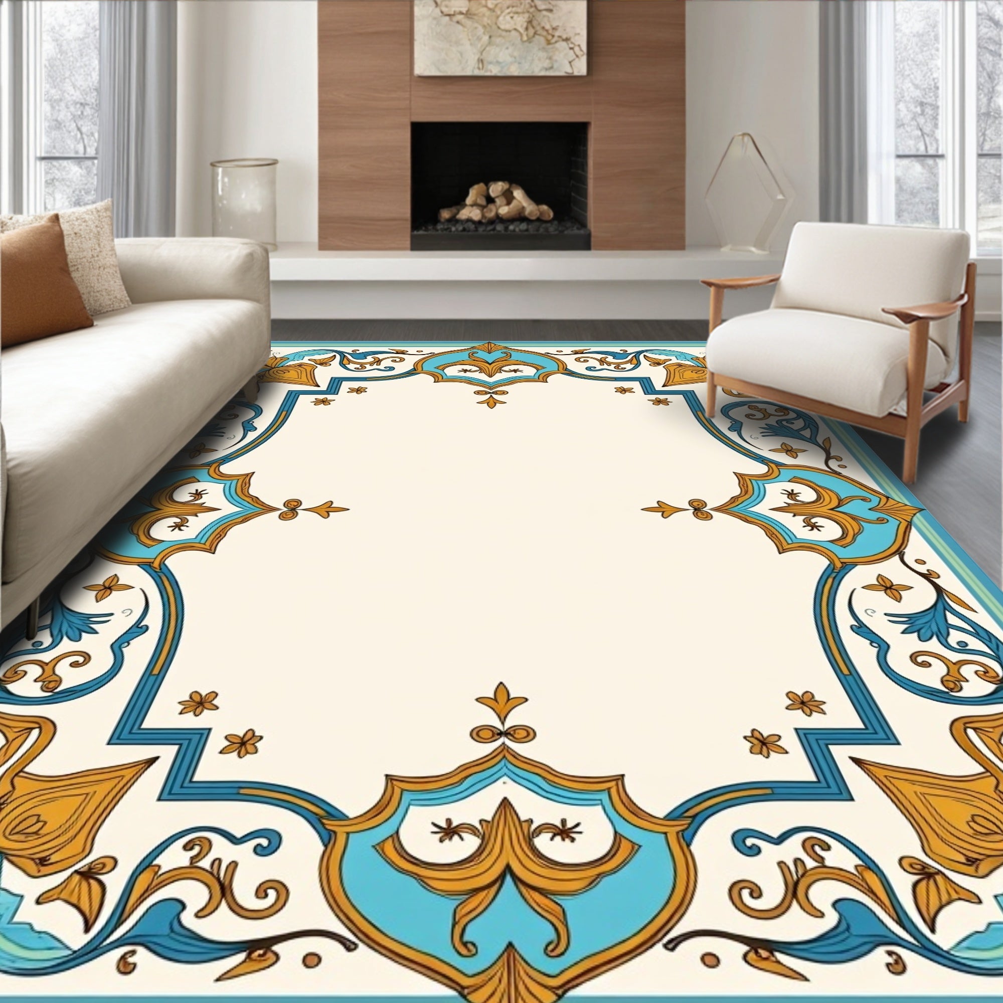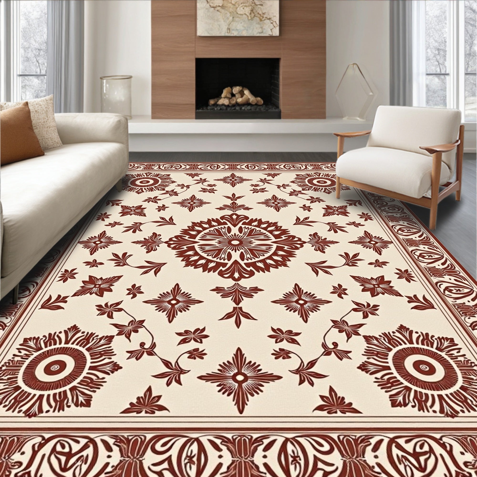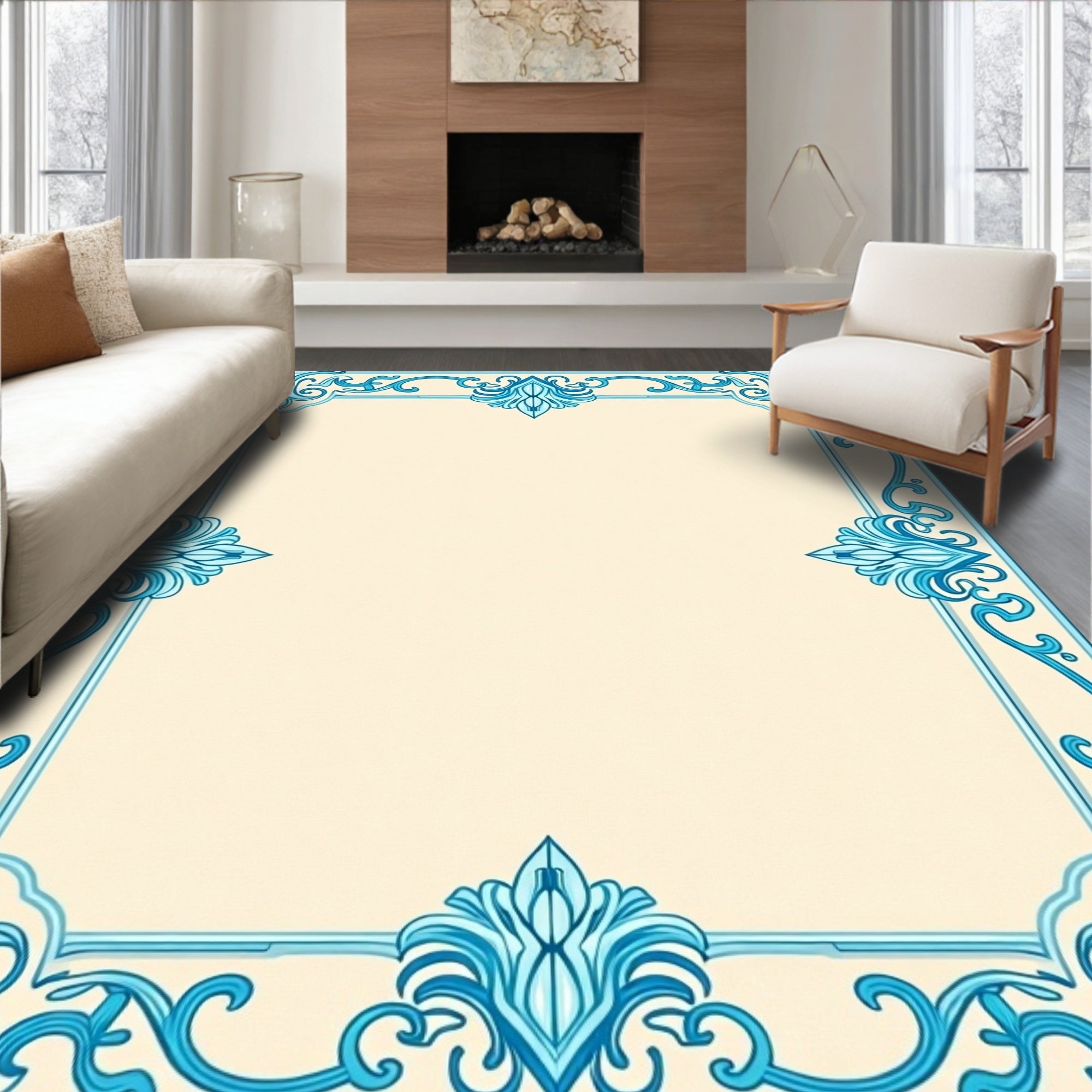 Damask Scrollwork with Vintage Ornamental Border Design (Beige)