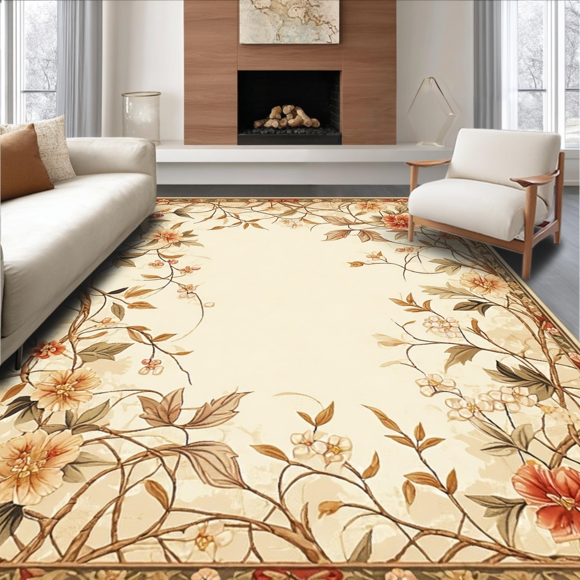 Botanical Scrollwork Transitional Floor Cover with Floral Accents(Beige)