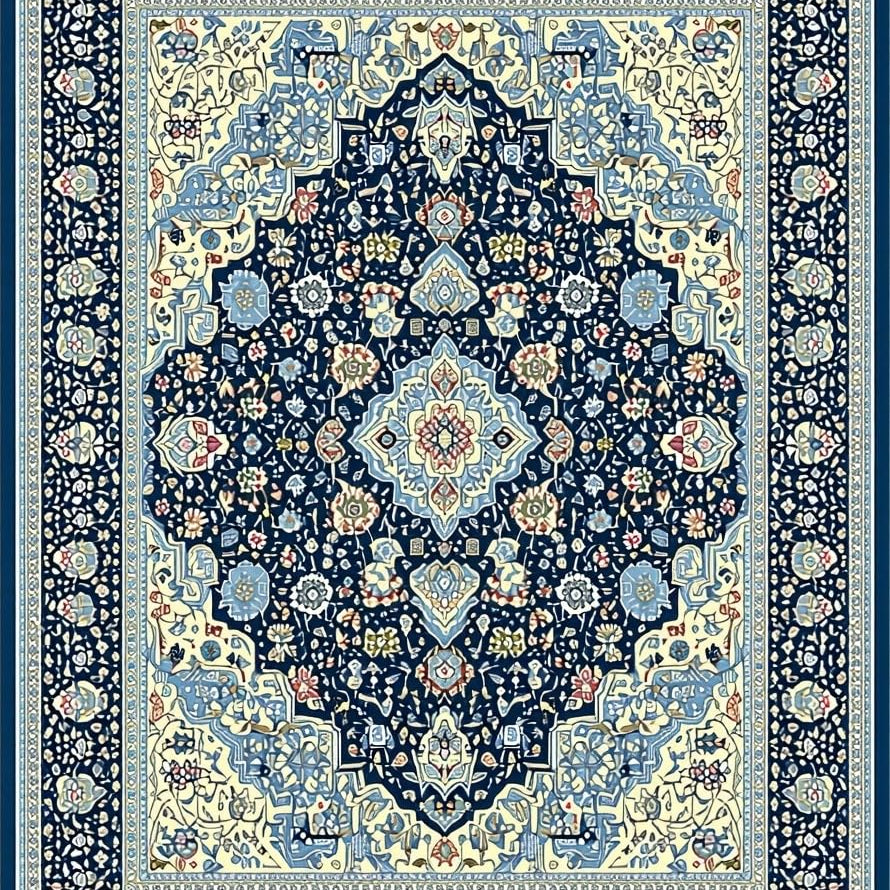Coastal Floral Medallion Area Navy Beige Easy Care(Blue)