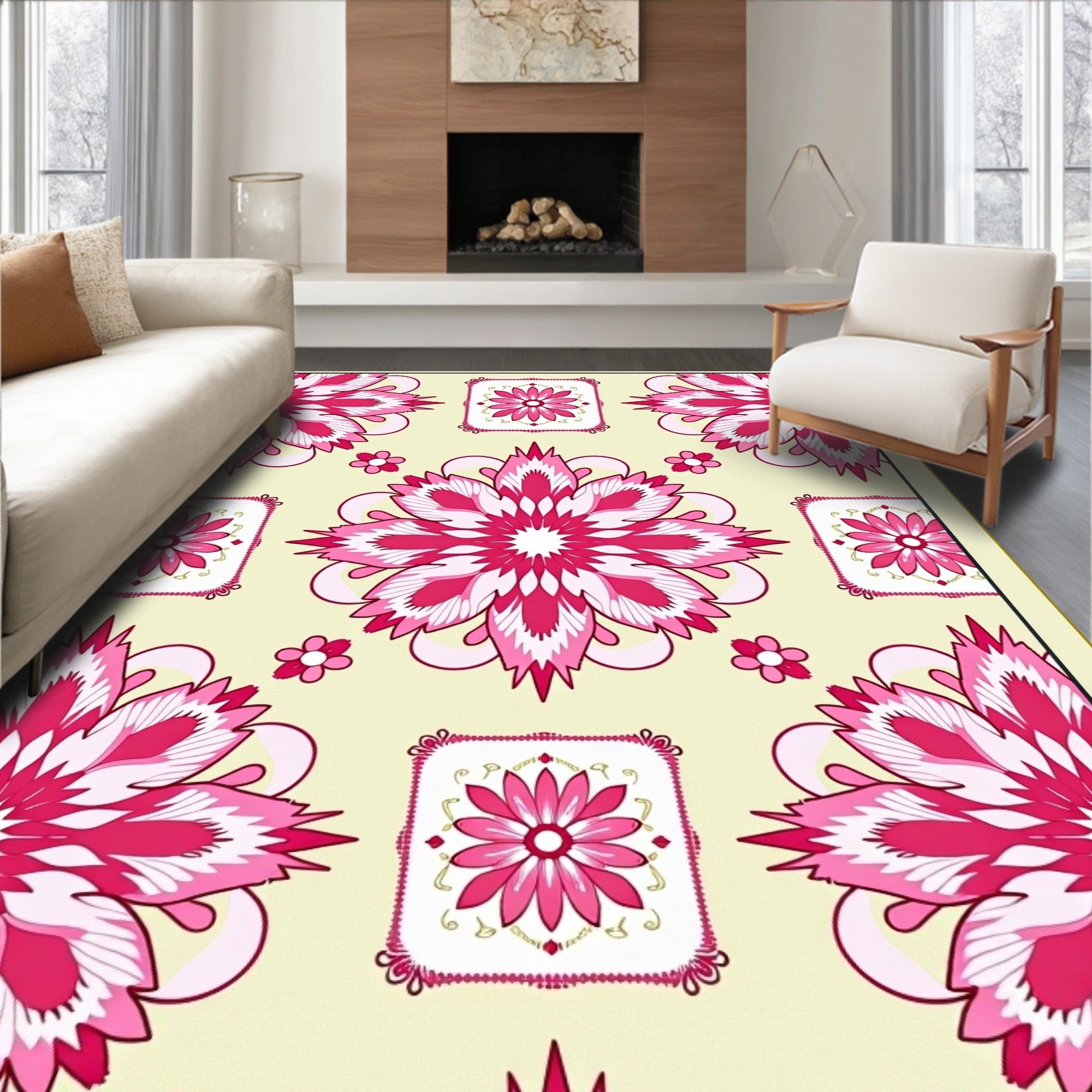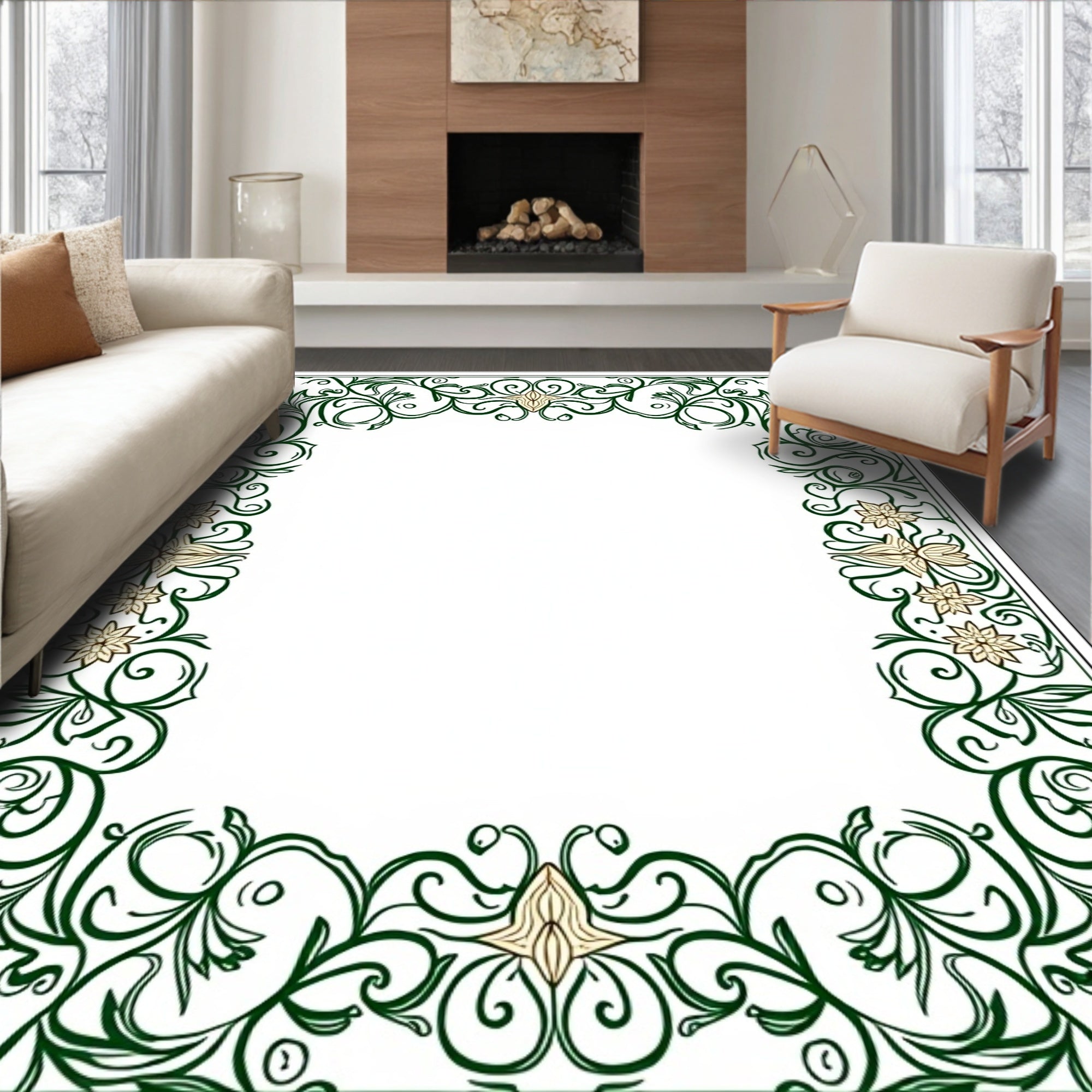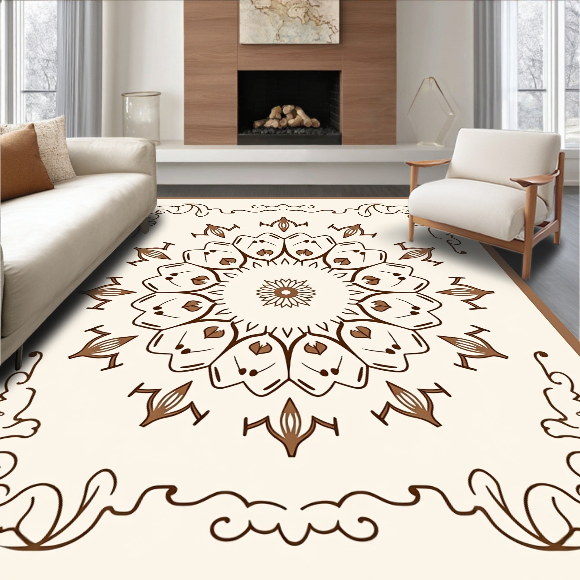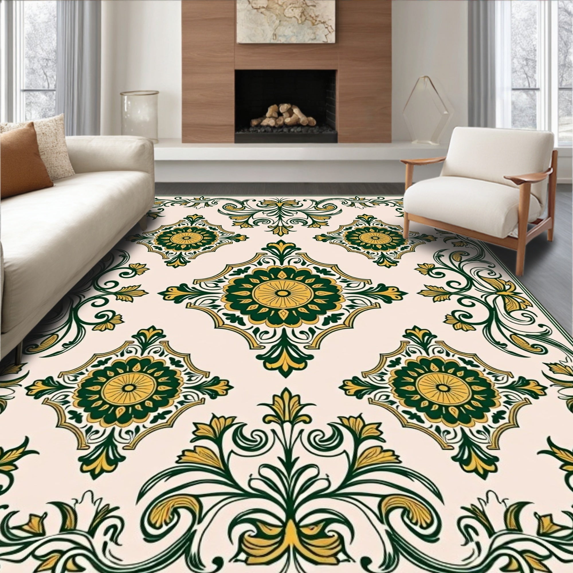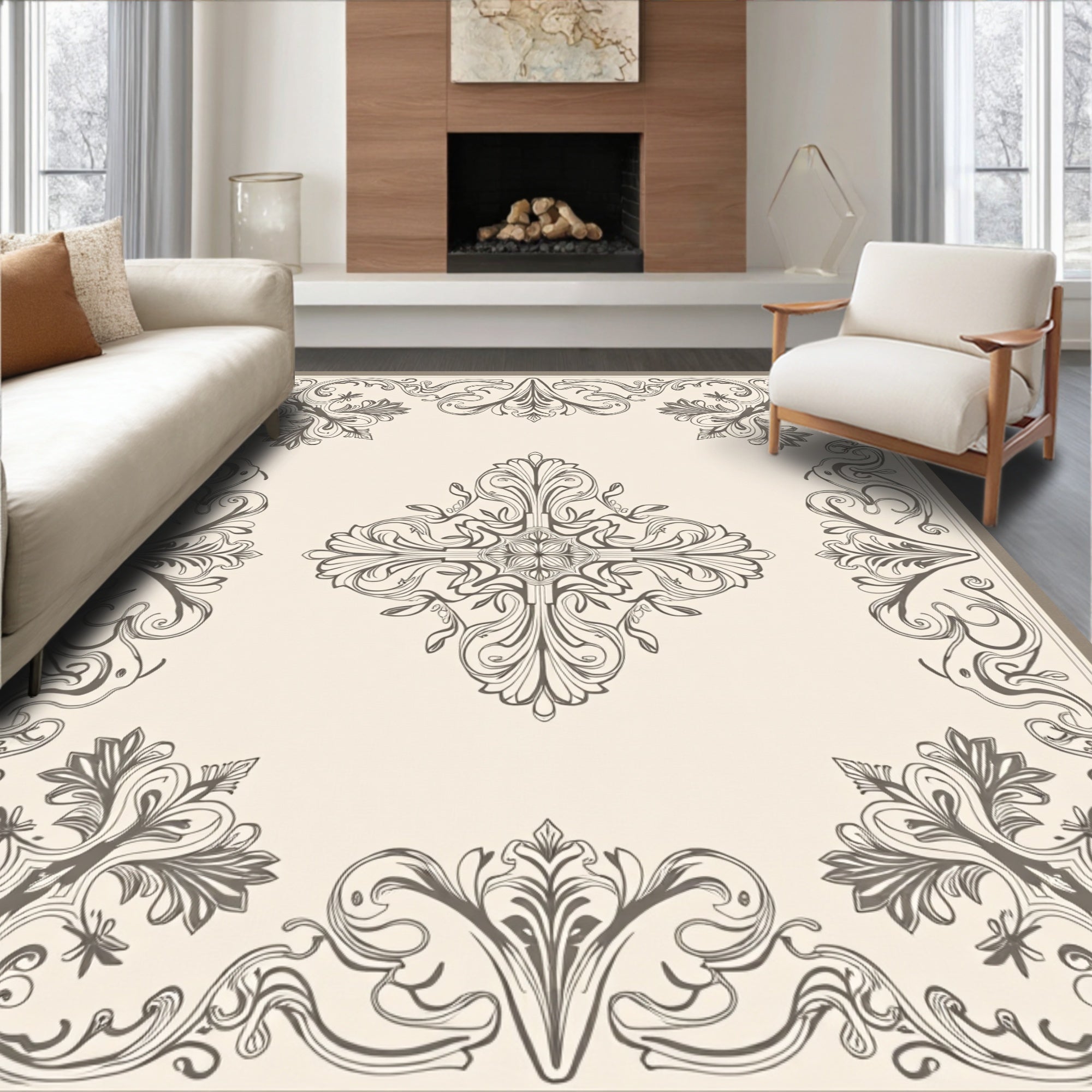 Damask Floral Motif Non Shedding Floor Covering(Beige)