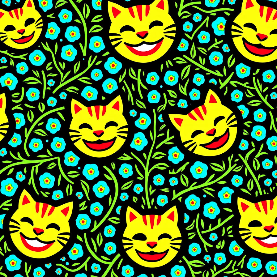Cartoon Cat Faces with Cheerful and Interlocking Floral Vines(Yellow)