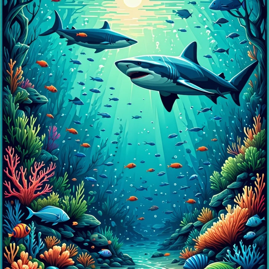 Nautical Shark Design Area Rug with Intricate Ocean Life Patterns(Blue)