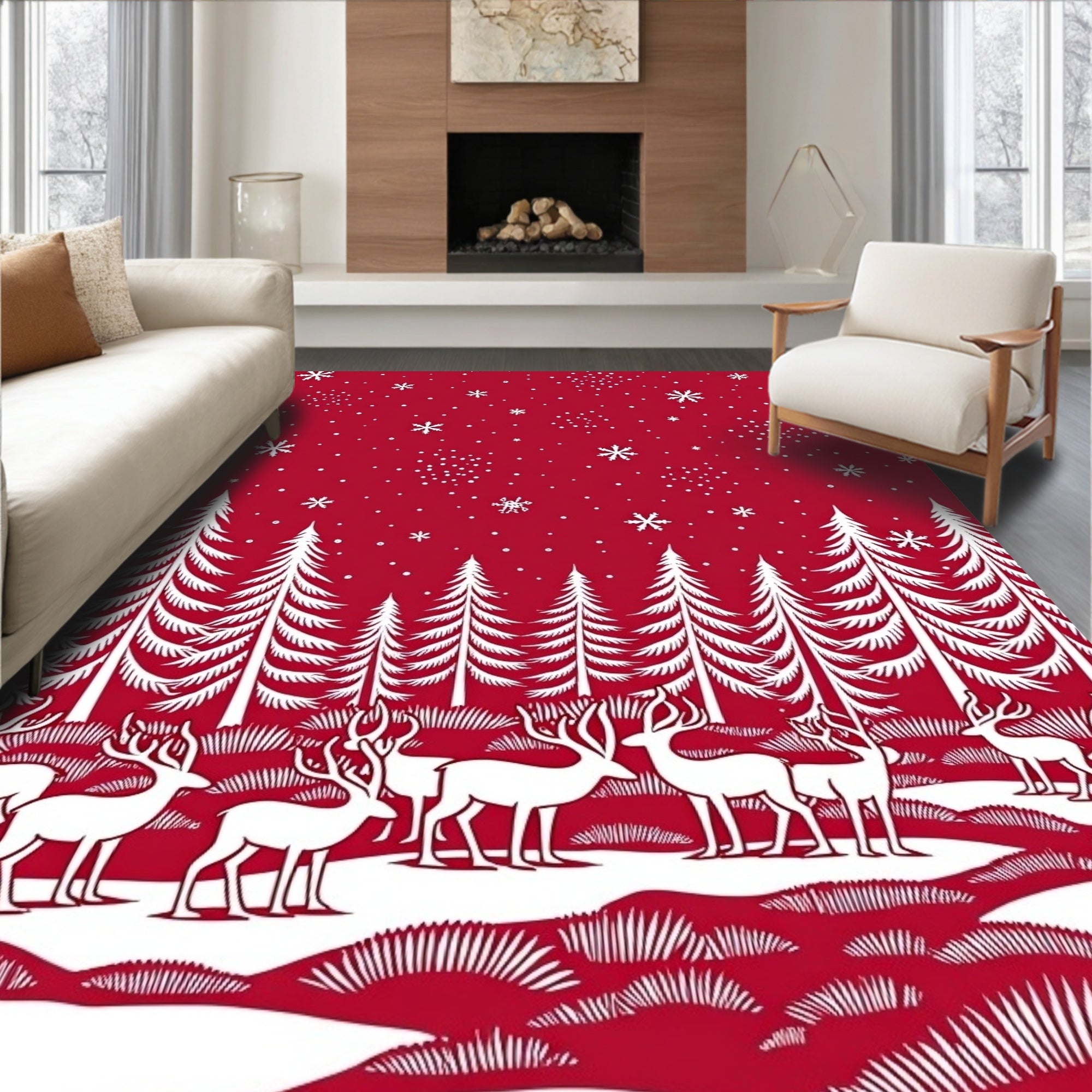 Reindeer Forest Scene Seasonal Floor Covering(Black)