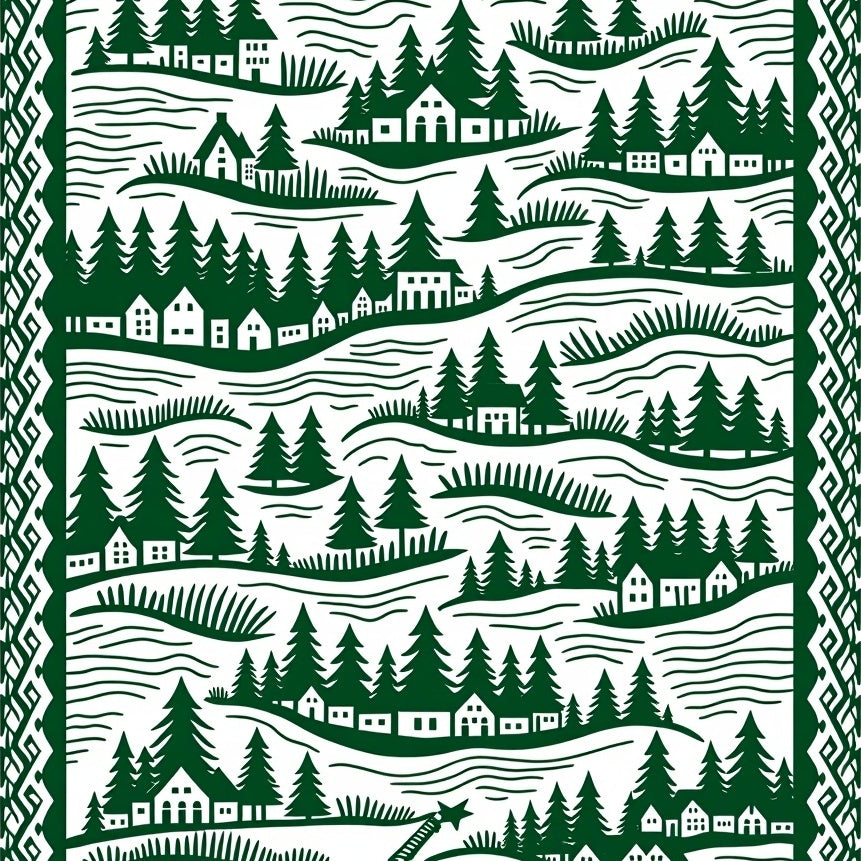 Nordic Winter Village Scene Textured Celebration Contemporary Design(Green)