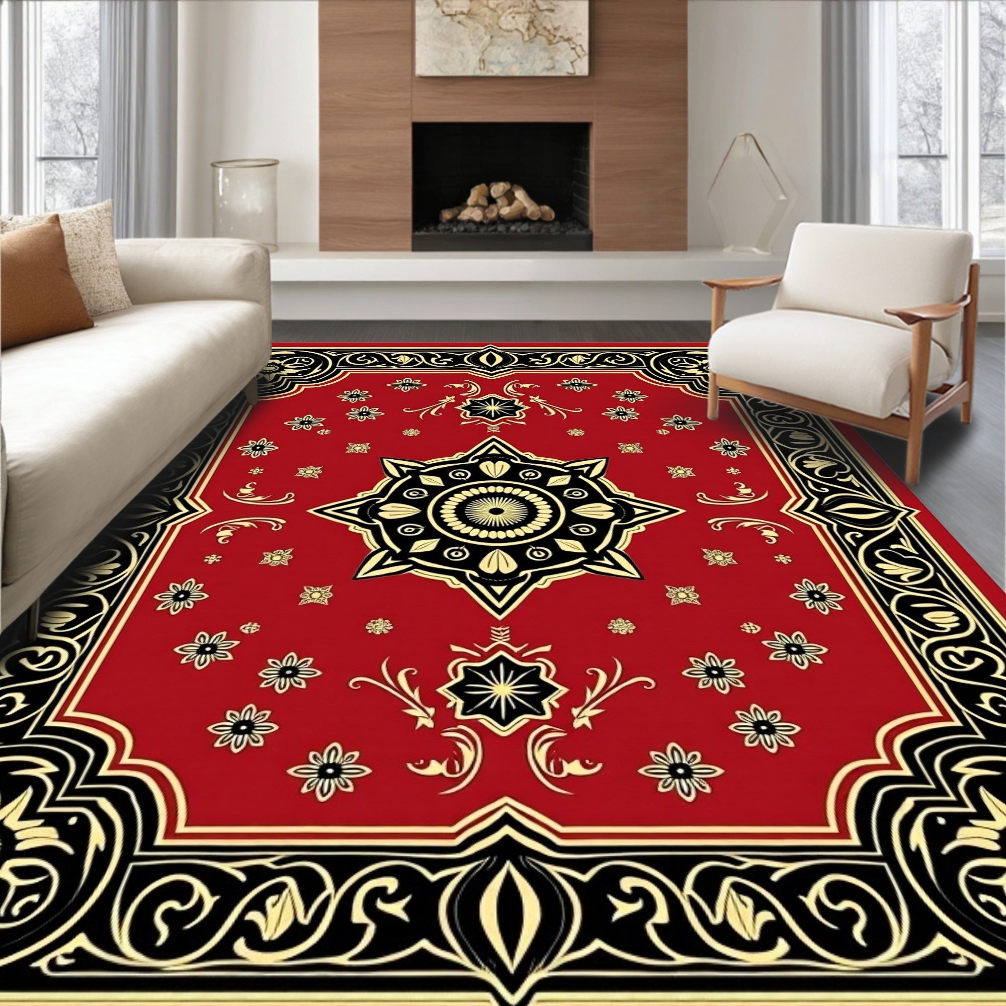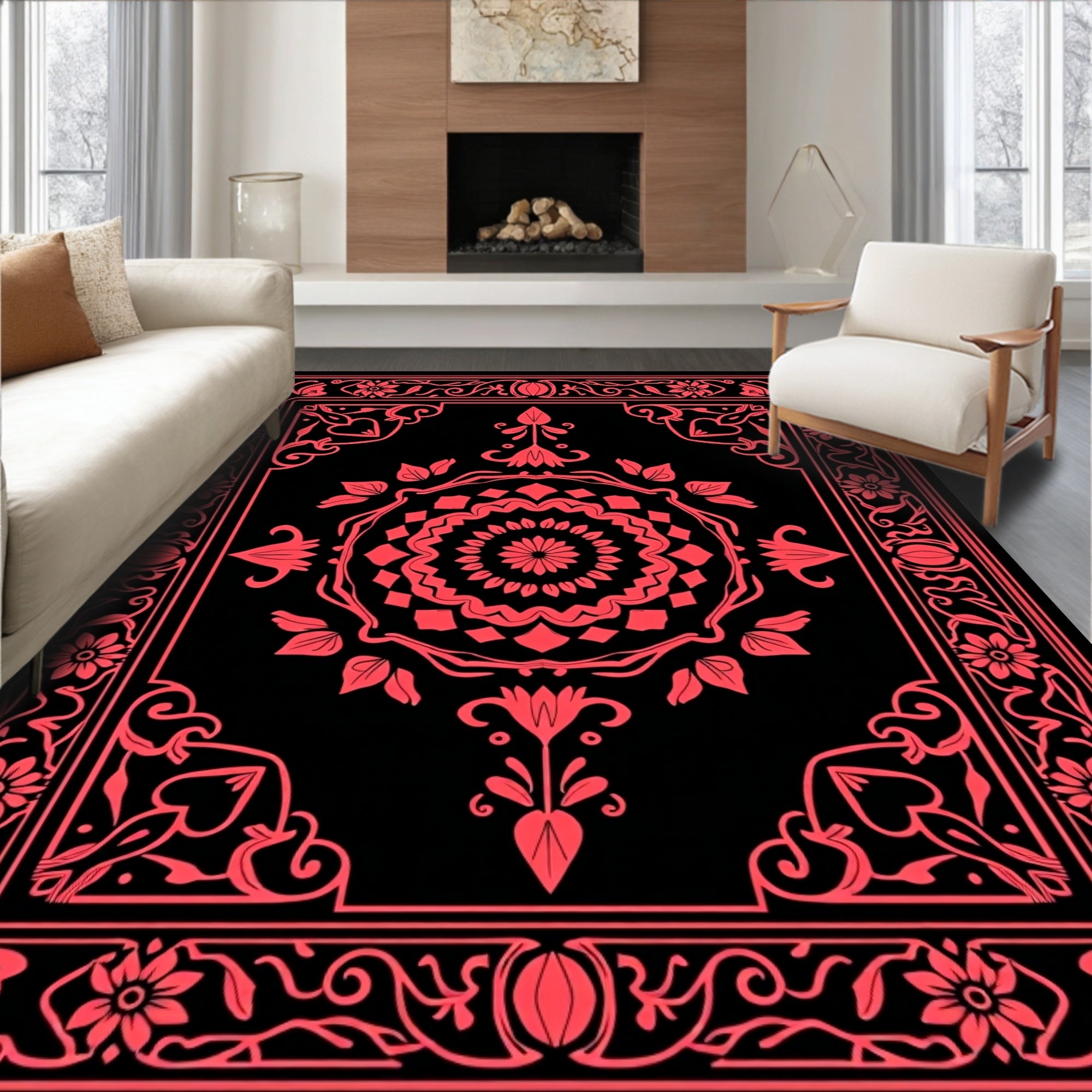 Vintage Botanical Medallion Area with Ornate Scrollwork(Black)