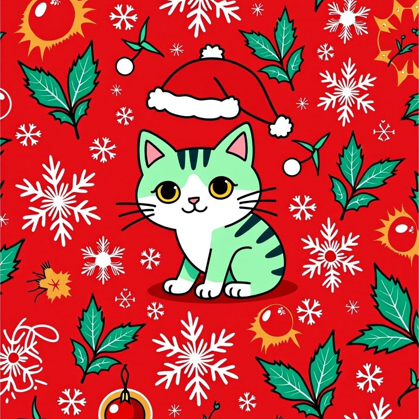 Whimsical Cat in Santa Hat with Snowflake and Holiday Ornament Design(Red)