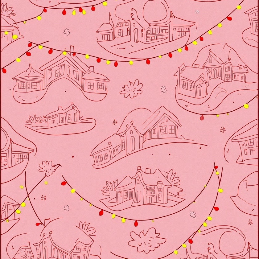 Holiday Village Cat Scene Featuring String Lights and Snow(Pink)