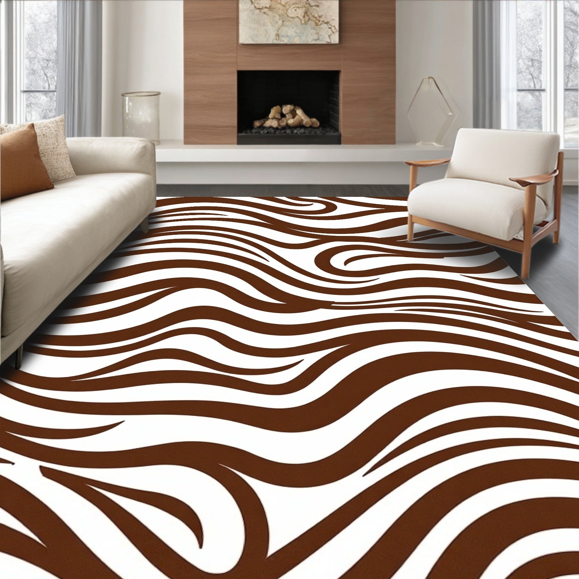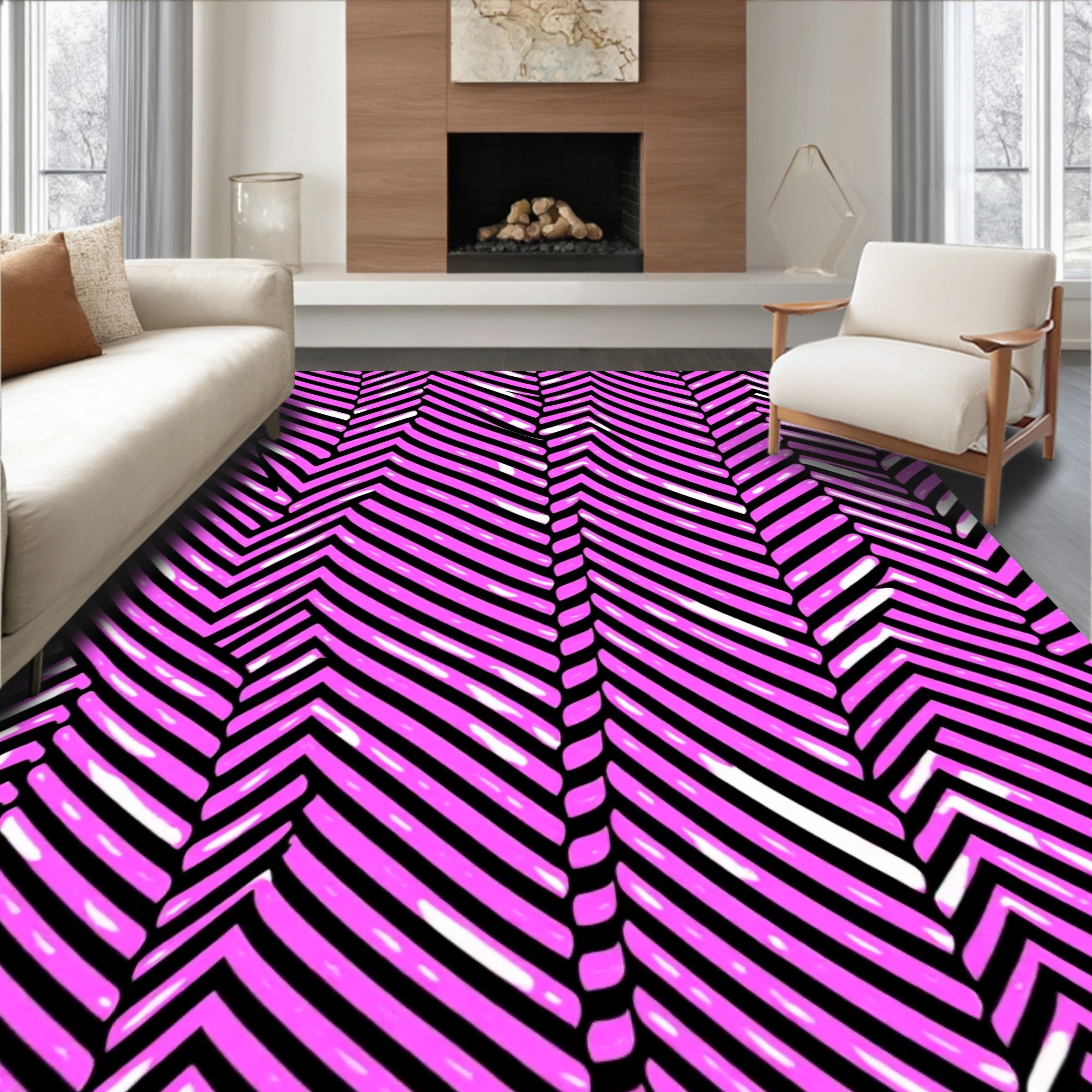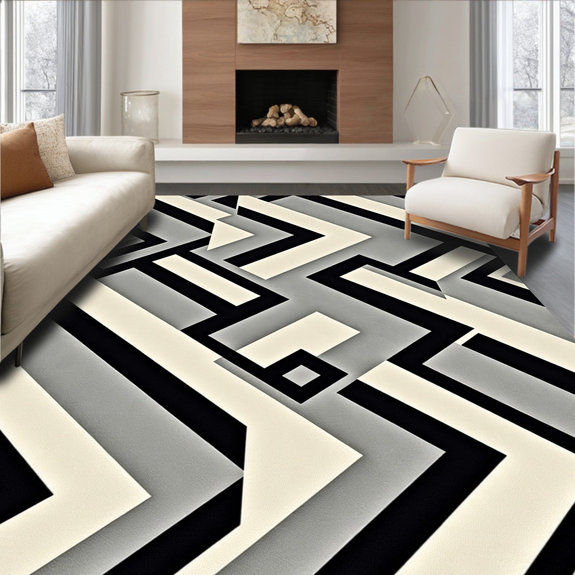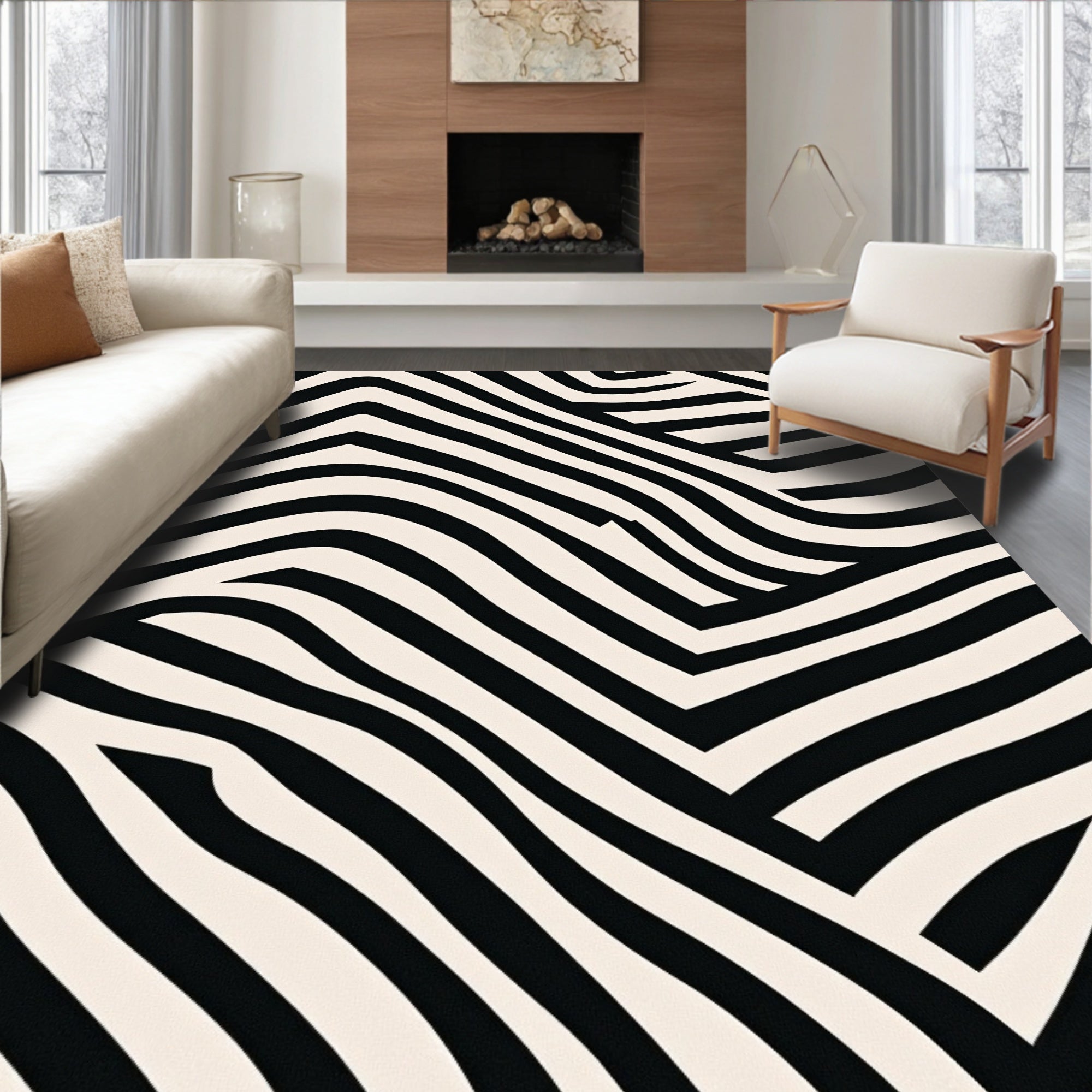 Abstract Chevron Wave Design Floor Covering with Bold Stripes(Black)