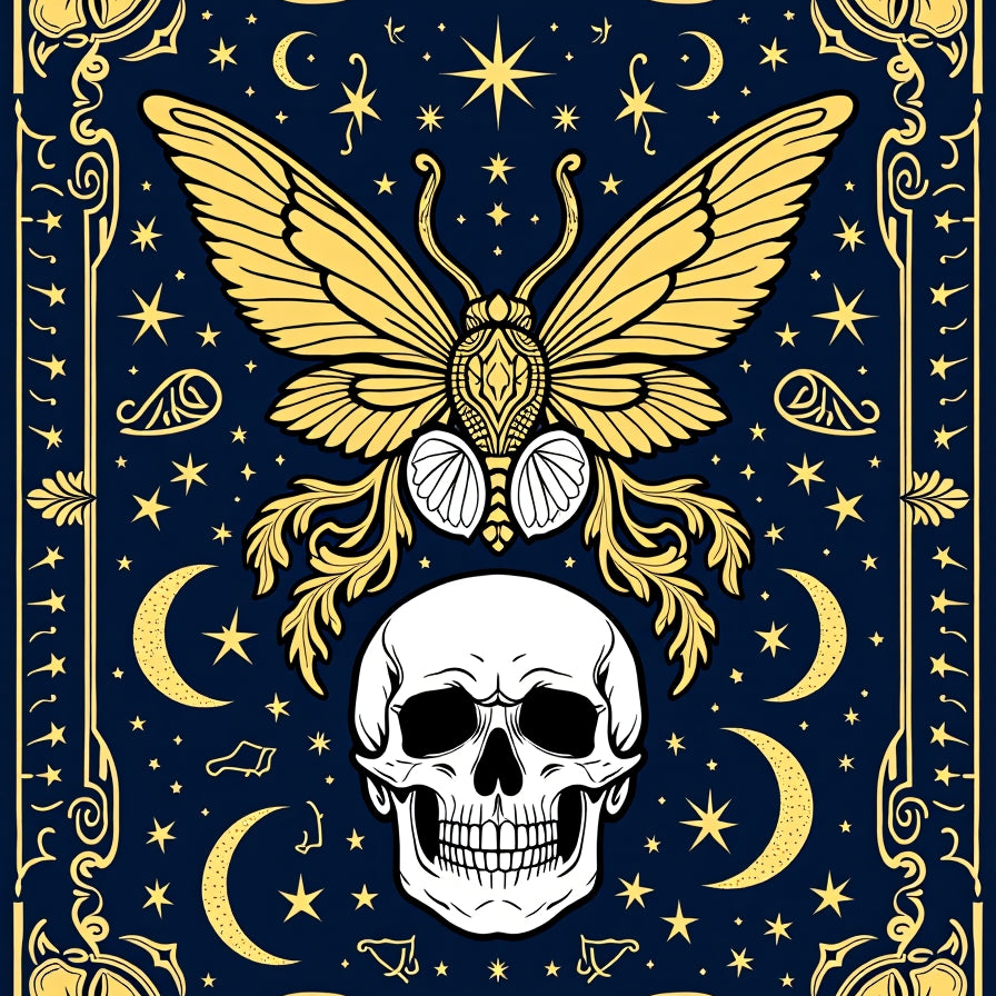 Astrological Skull Collage with Moth Wings and Celestial Embellishments(Gold)