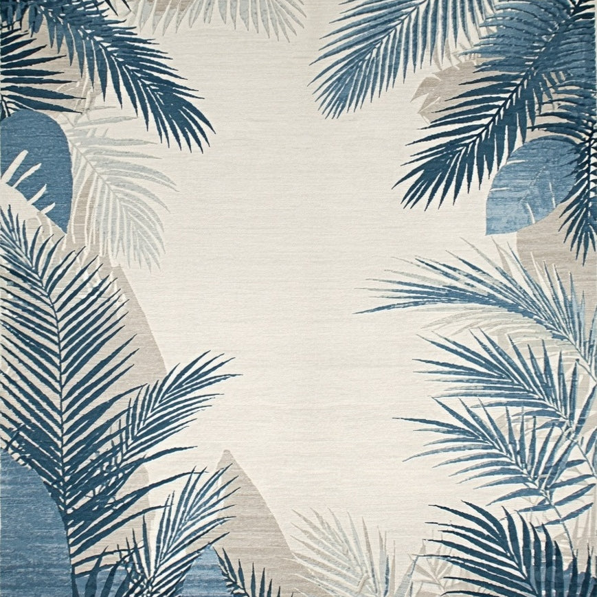 Blue Grey and Beige Botanical Motif Area with Palm Leaves(Blue)