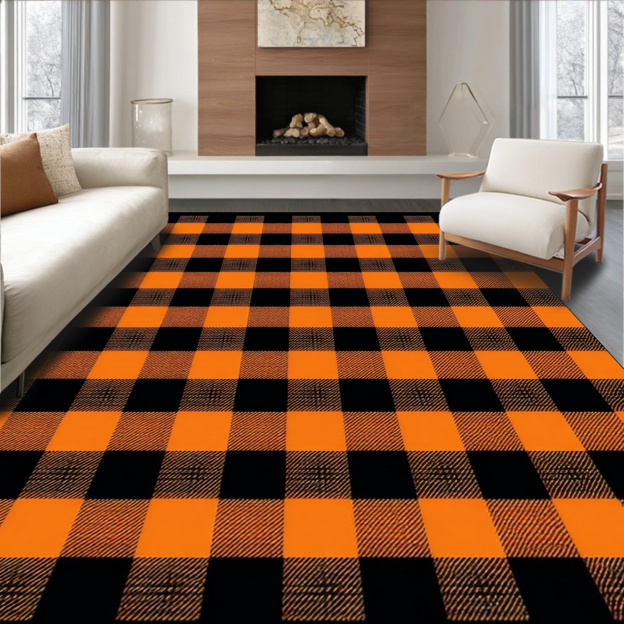 Halloween Plaid Area Rug Spooky Black & Orange Carpet with Pumpkin Design(Orange)