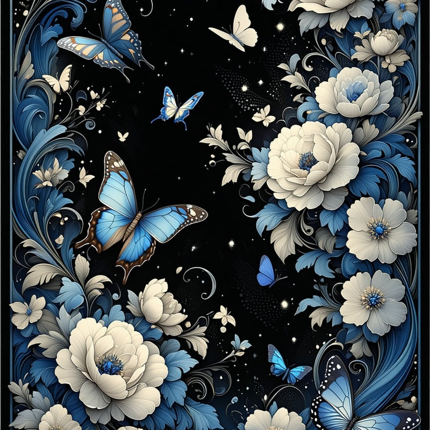 Dreamscape Black Surreal Floral Butterflies Artistic Flourishes(Blue)