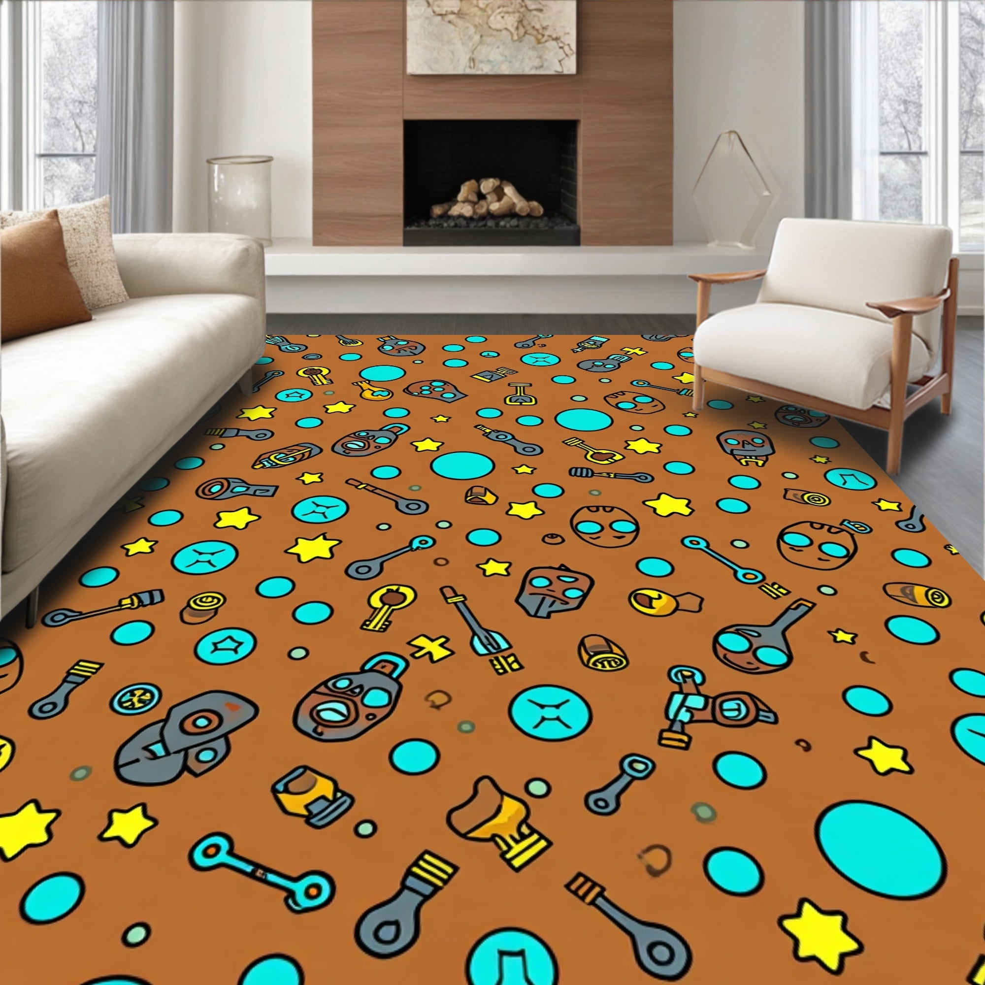 Retro Gaming Symbols Interlocking Grid with Potion and Accents(Brown)