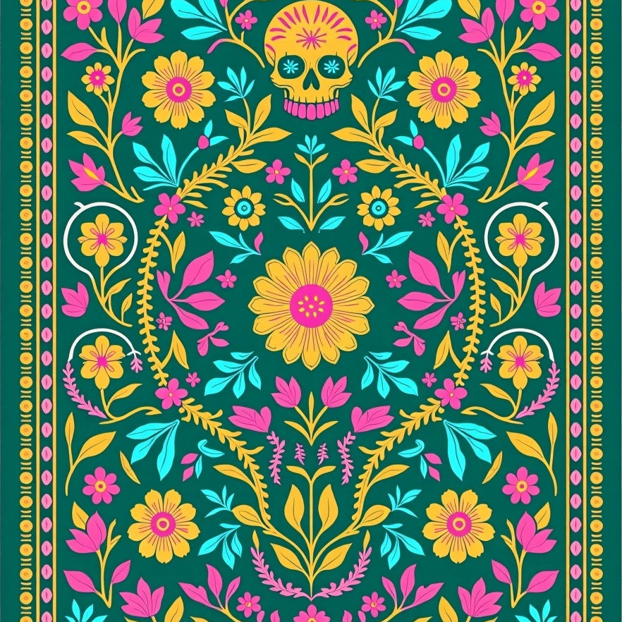 Folk Art Floral Skull with Lively Botanical Embellishments (Green)