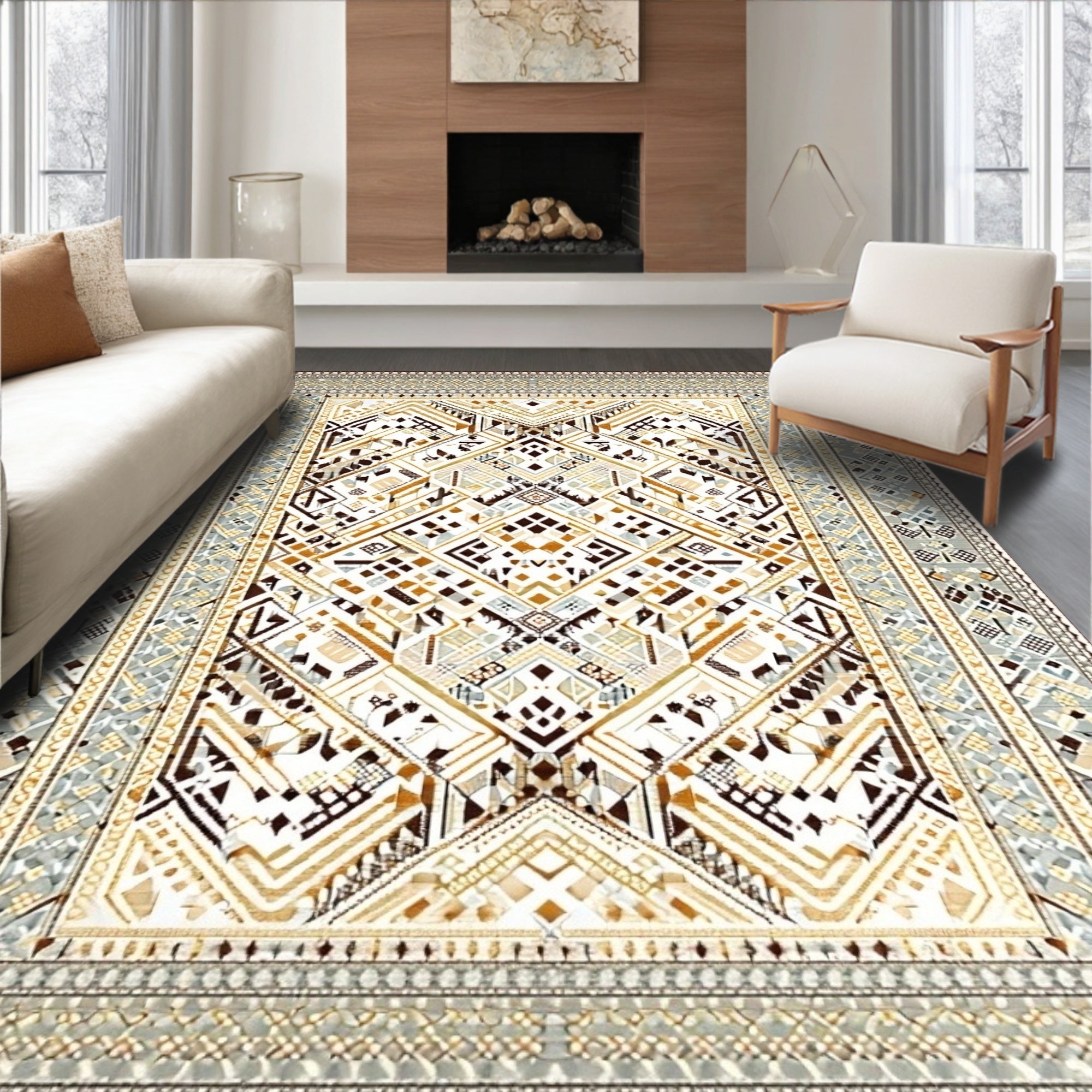 Charming Beige Checkered Area with Geometric(Beige)