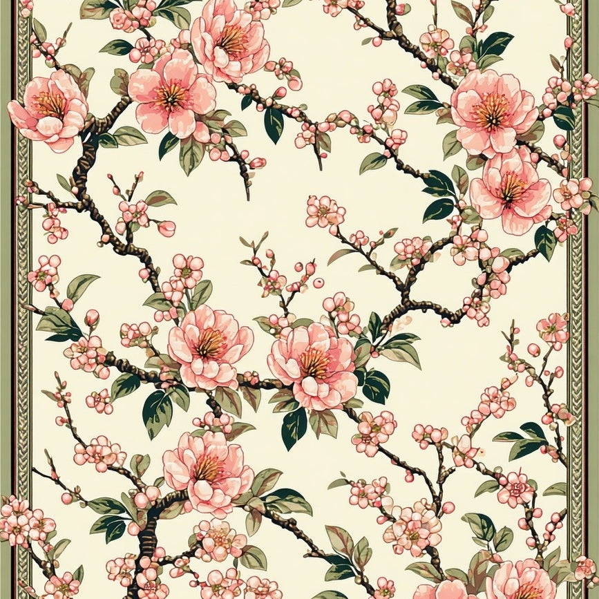 Pastel Boho Pink Cherry Blossoms Green Leafy Swirls(Ivory)