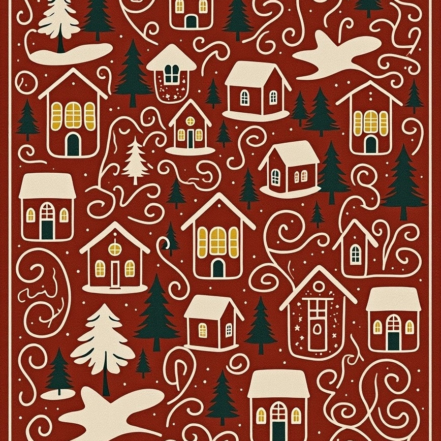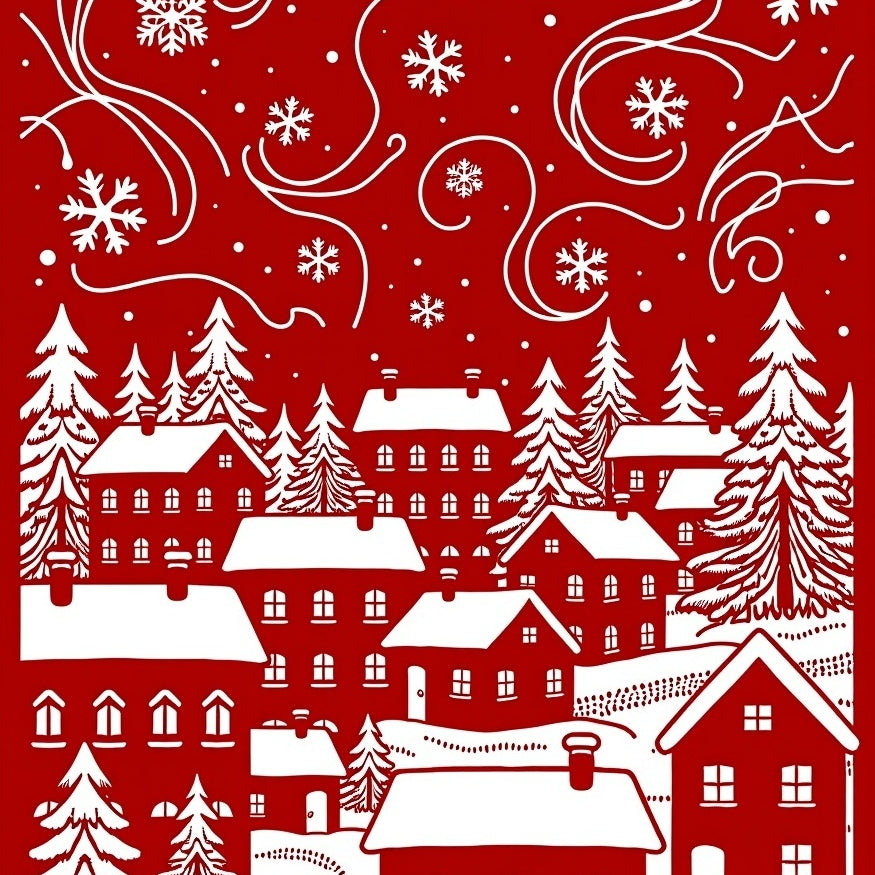 Joyful Holiday Village Scene with Cabins and Twinkling Snow Drifts(Red)