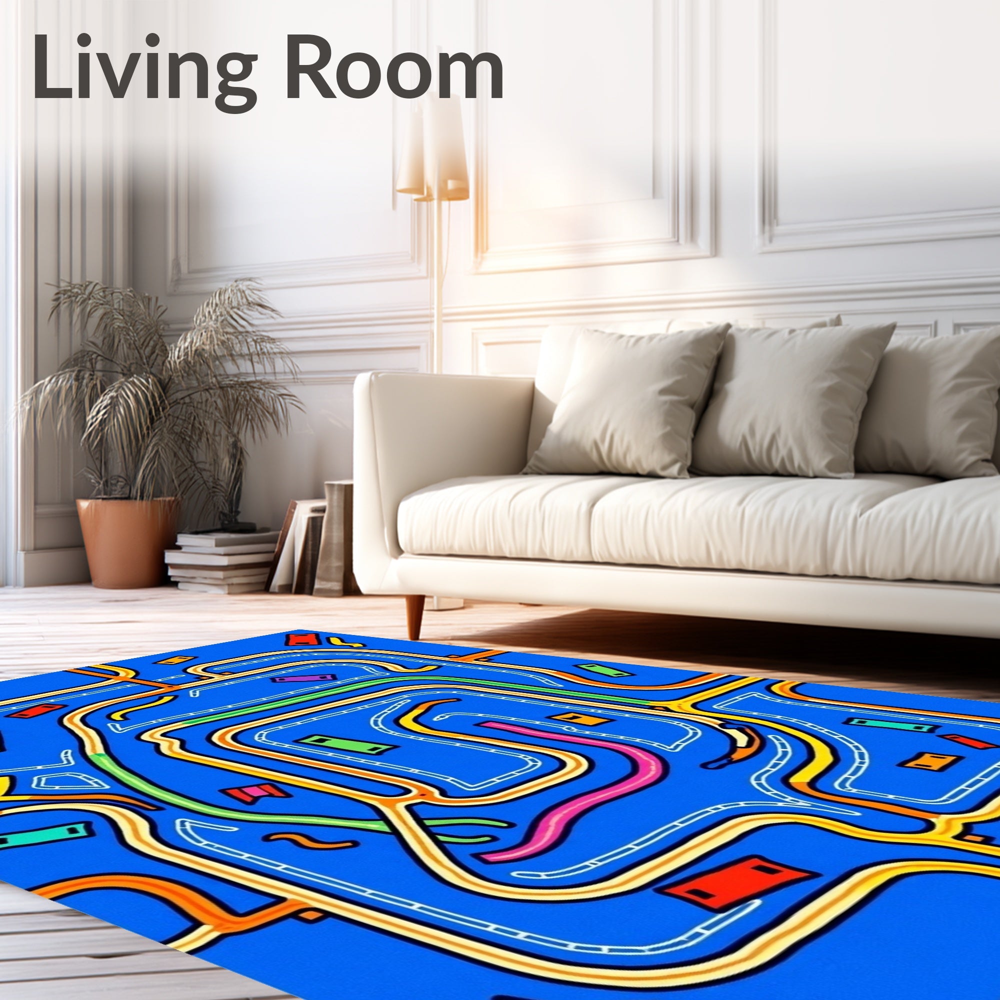 Flatwoven High Traffic Area Rug, Adventure Highway Interlocking Maze with Playful Vehicles Motif, Non Slip, Stain Resistant, Washable Area Rugs for Living Room, Bedroom (Blue) Overview: