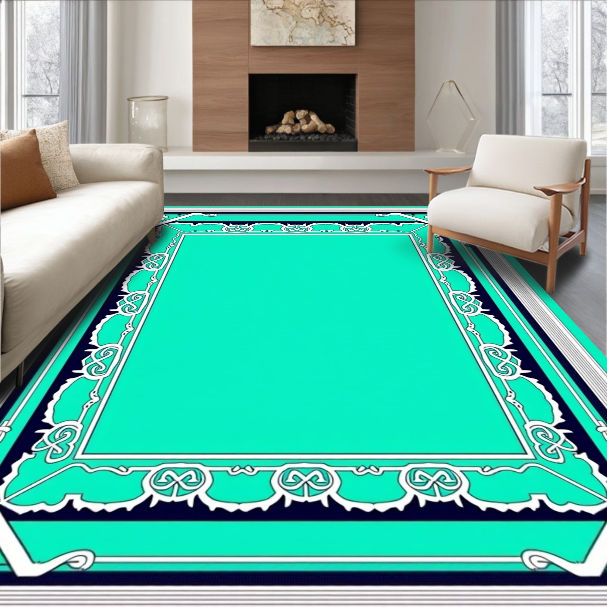 Flatwoven High Traffic Area Rug, Art Chevron Frame with Stylized Fan Accents, Non Slip, Stain Resistant, Washable Area Rugs for Living Room, Bedroom (Turquoise) Overview: