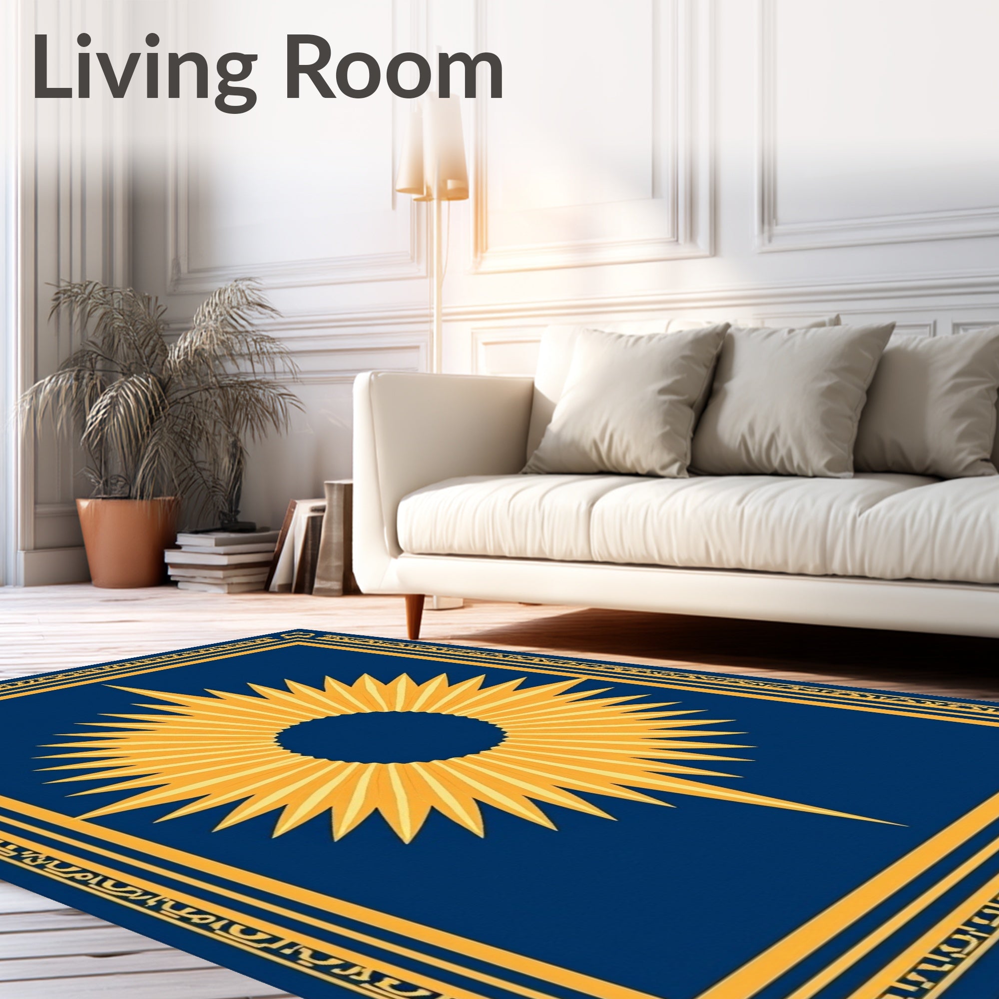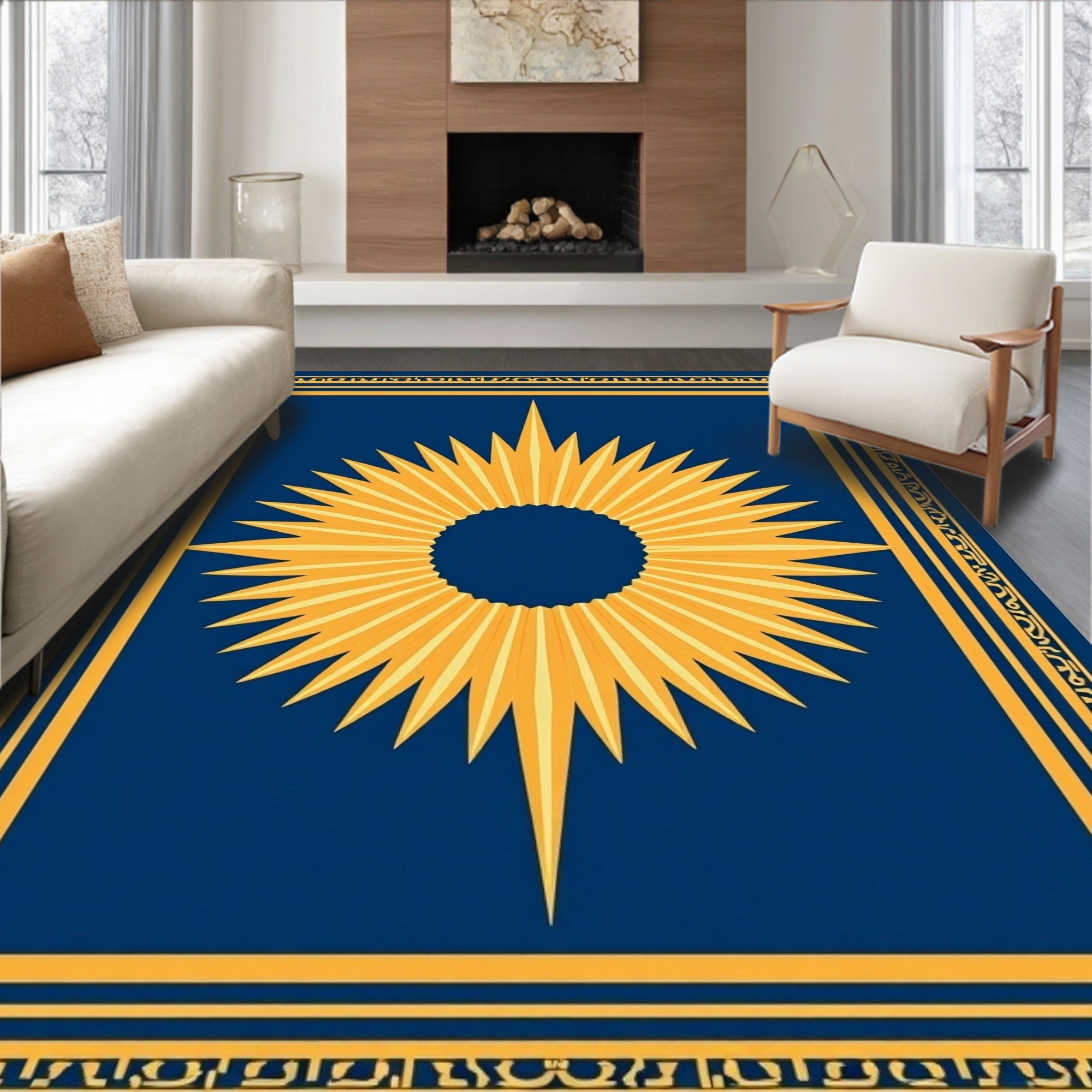 Flatwoven High Traffic Area Rug, Art Inspired Sunburst with Radiant Gold and Deep Ochre Details, Non Slip, Stain Resistant, Washable Area Rugs for Living Room, Bedroom (Blue) Overview: