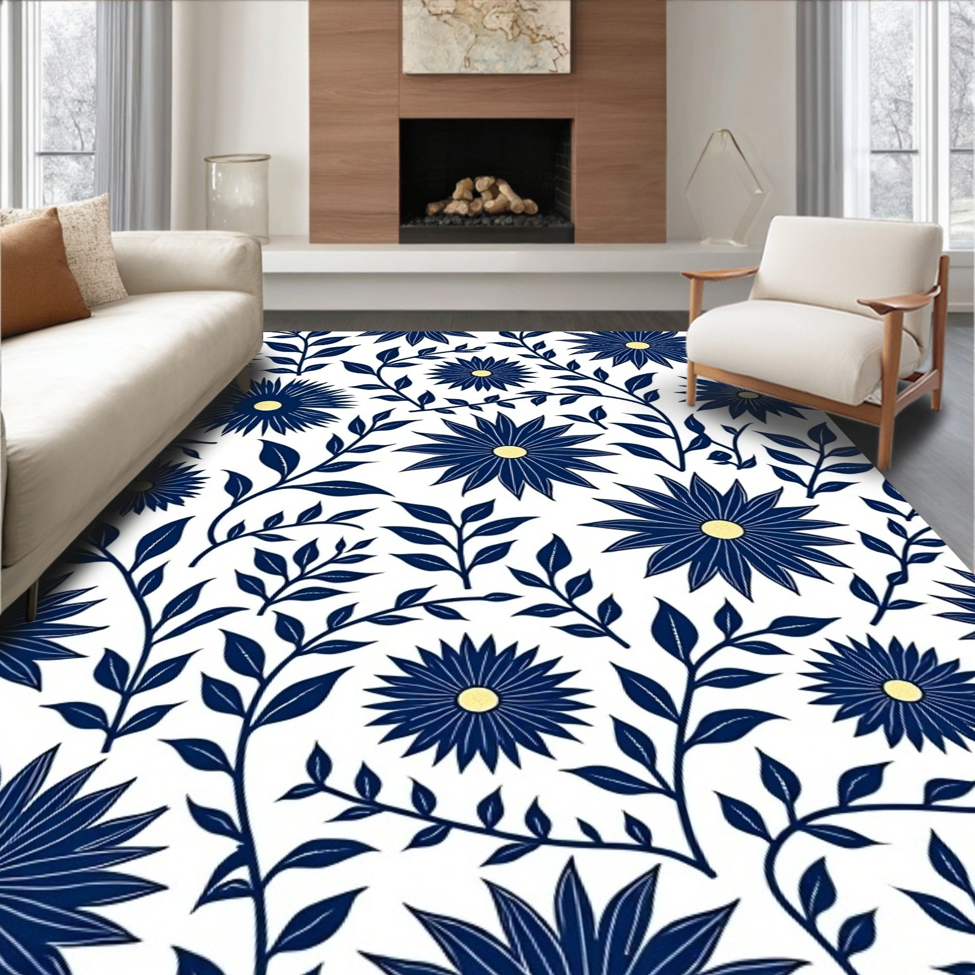 Flatwoven High Traffic Area Rug, Art Nouveau Blossom Swirl with Ornate Interlocking Leaf, Non Slip, Stain Resistant, Washable Area Rugs for Living Room, Bedroom (Blue) Overview: