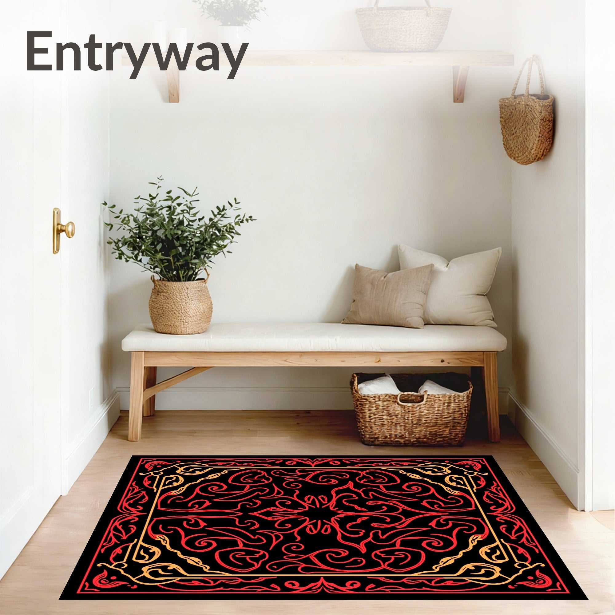 Flatwoven High Traffic Area Rug, Art Nouveau Wave Design with Flowing Scroll Accents and Stylized Florals, Non Slip, Stain Resistant, Washable Area Rugs for Living Room, Bedroom (Black) Overview: