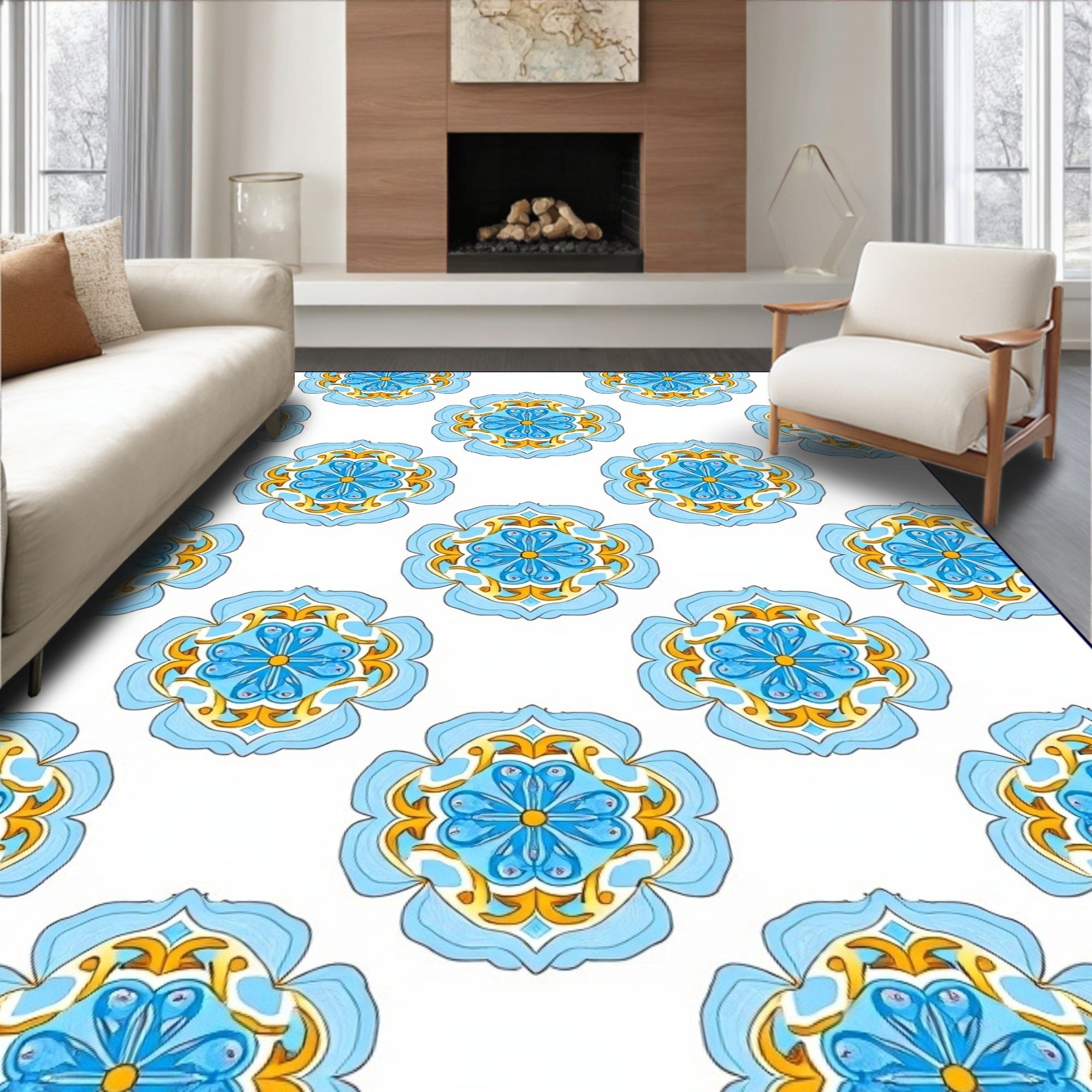 Flatwoven High Traffic Area Rug, Artisan Brushstroke with Interlocking Floral Medallions, Non Slip, Stain Resistant, Washable Area Rugs for Living Room, Bedroom (Blue) Overview: