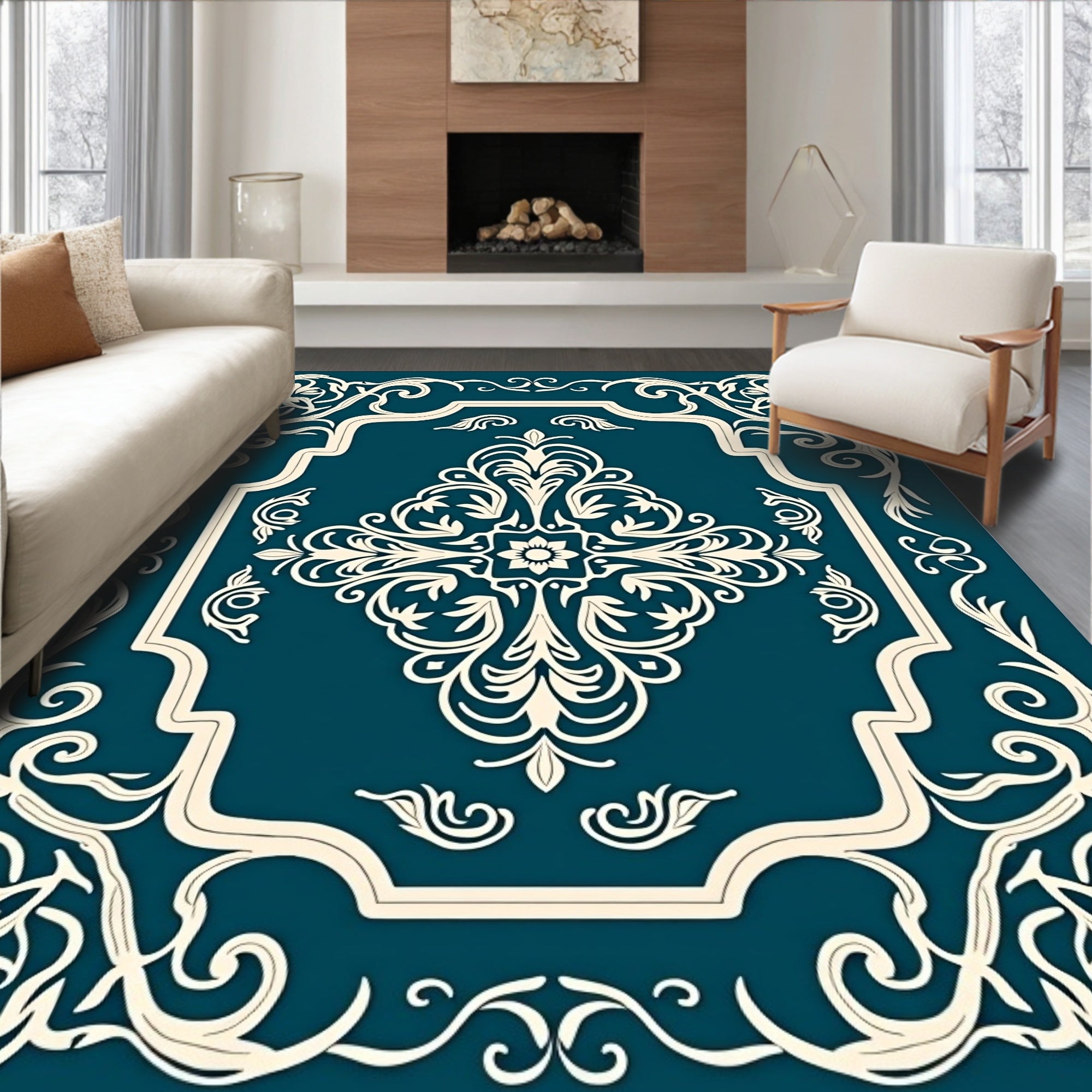 Flatwoven High Traffic Area Rug, Baroque Floral Vinework with Whimsical Curlicue Details, Non Slip, Stain Resistant, Washable Area Rugs for Living Room, Bedroom (Blue) Overview: