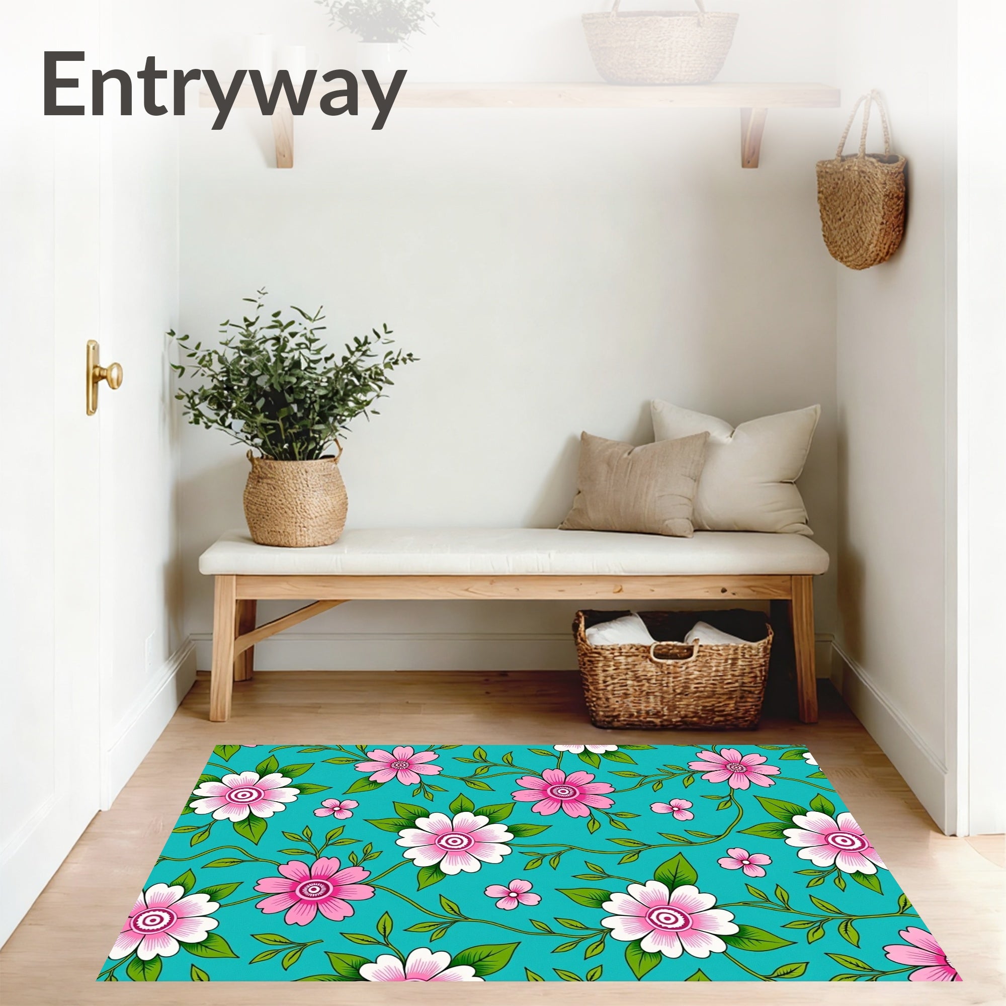Flatwoven High Traffic Area Rug, Blossoming Garden Entrance Welcome Floral Decorative Doorway, Non Slip, Stain Resistant, Washable Area Rugs for Living Room, Bedroom (Turquoise) Overview: