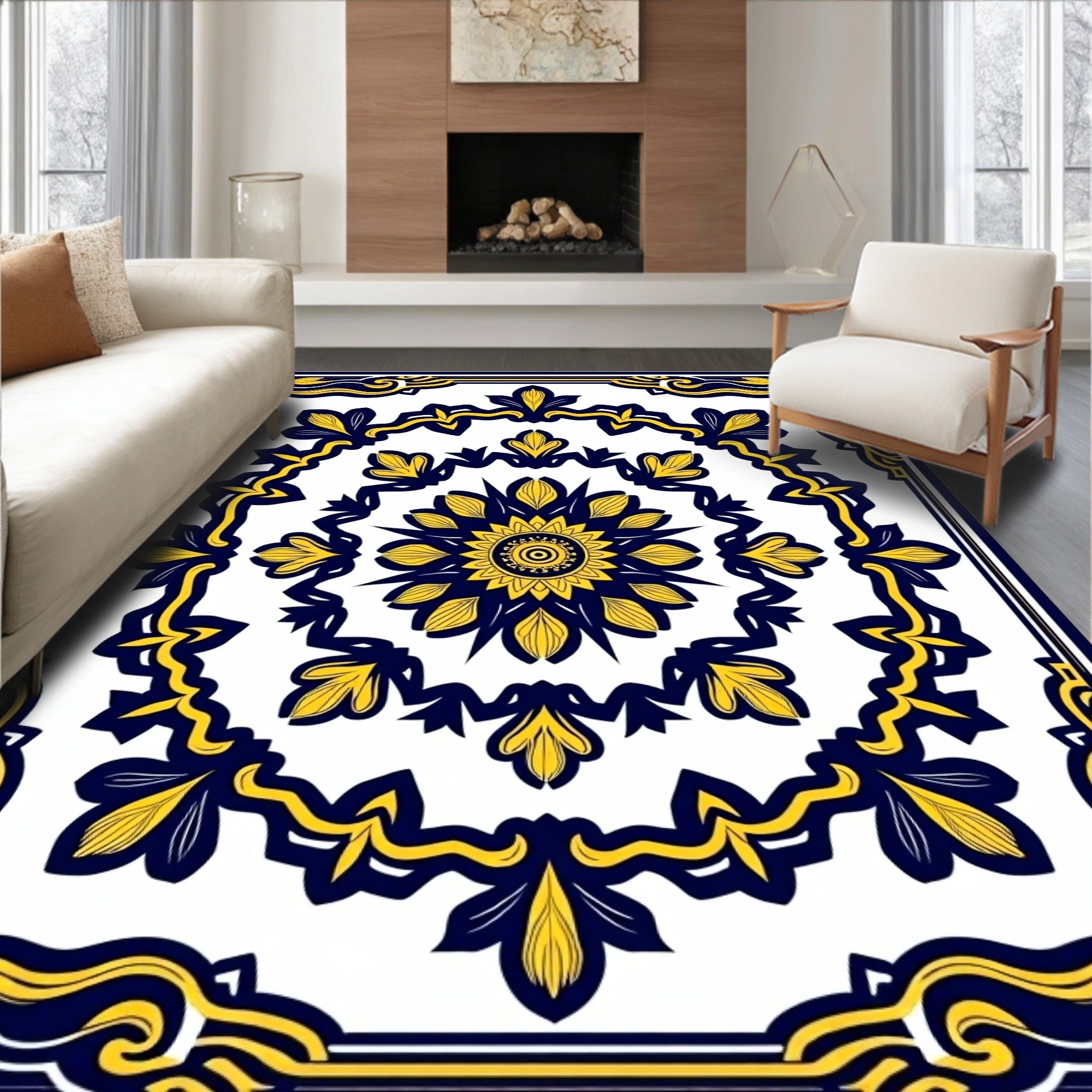Flatwoven High Traffic Area Rug, Burst Symmetrical Ornate Floral Motif Design, Non Slip, Stain Resistant, Washable Area Rugs for Living Room, Bedroom (Yellow) Overview: