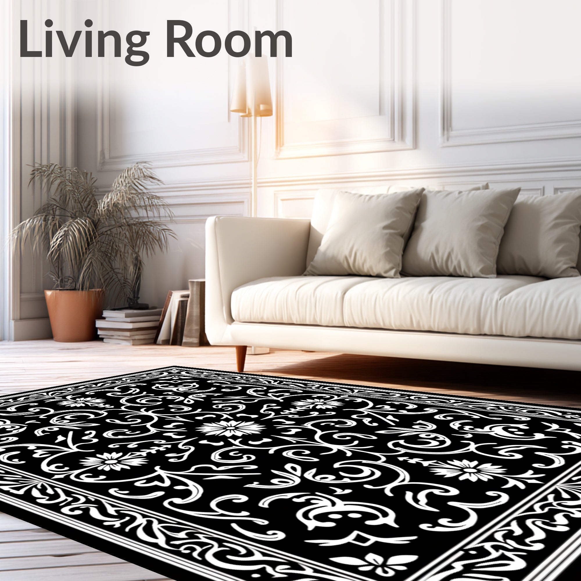 Flatwoven High Traffic Area Rug, Casbah Scrollwork with Baroque Interlocking Details, Non Slip, Stain Resistant, Washable Area Rugs for Living Room, Bedroom (Black) Overview: