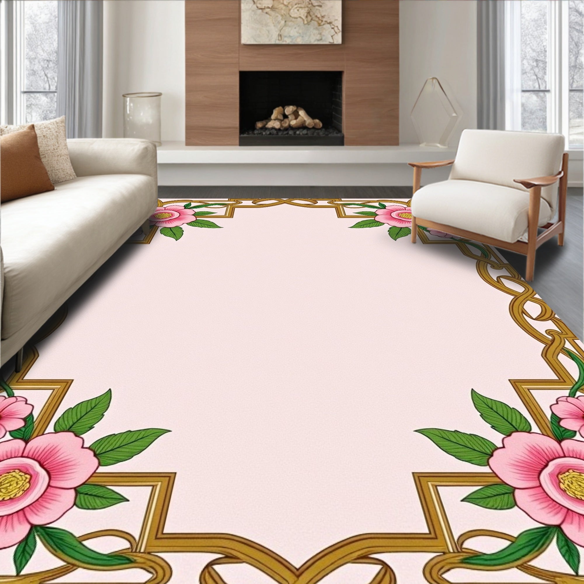 Flatwoven High Traffic Area Rug, Chinoiserie Peony Bouquet With Interlocking Lattice Accents, Non Slip, Stain Resistant, Washable Area Rugs for Living Room, Bedroom (Gold) Overview: