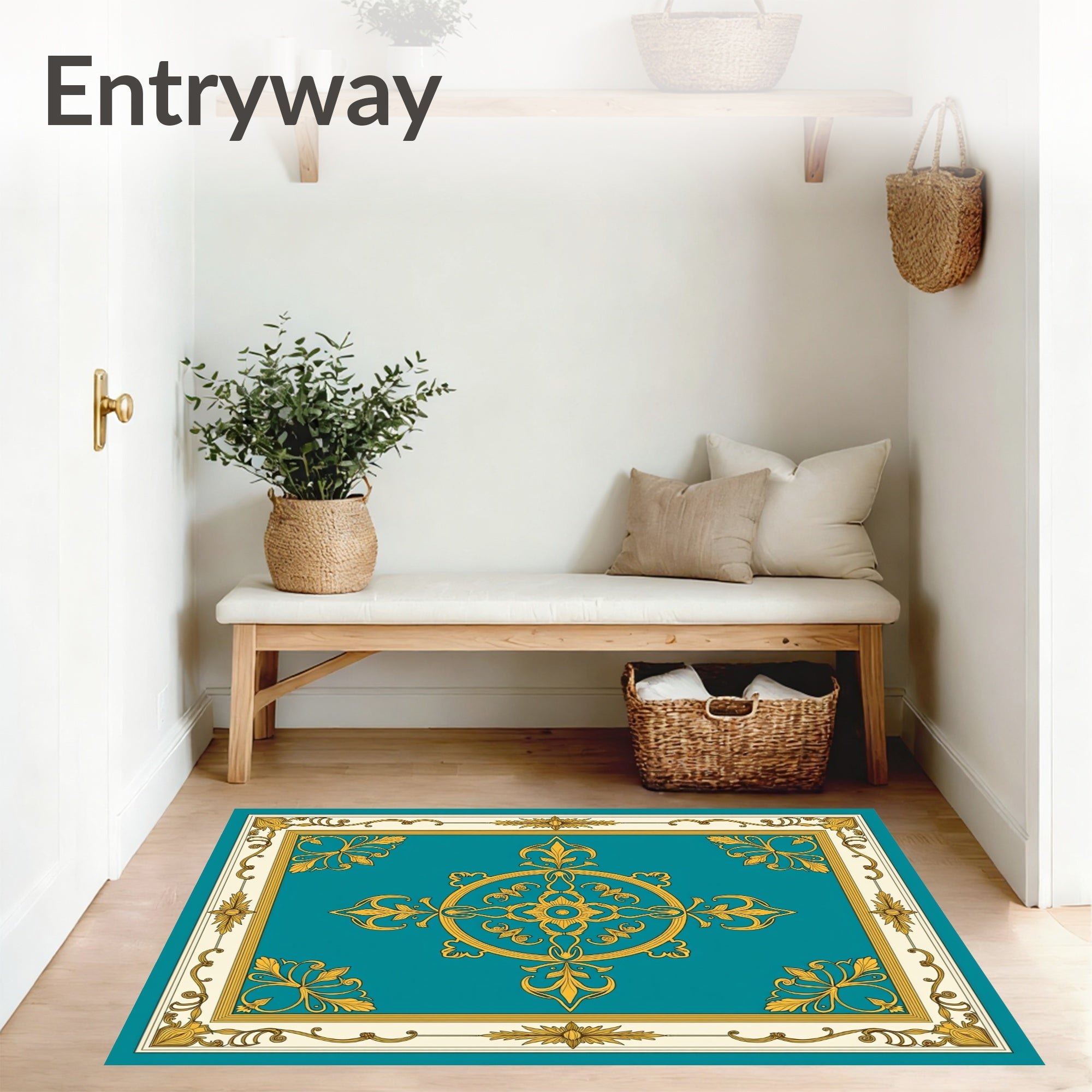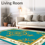Flatwoven High Traffic Area Rug, Classic Damask Scrollwork with Elegant Framed Edge Accent, Non Slip, Stain Resistant, Washable Area Rugs for Living Room, Bedroom (Teal) Overview: