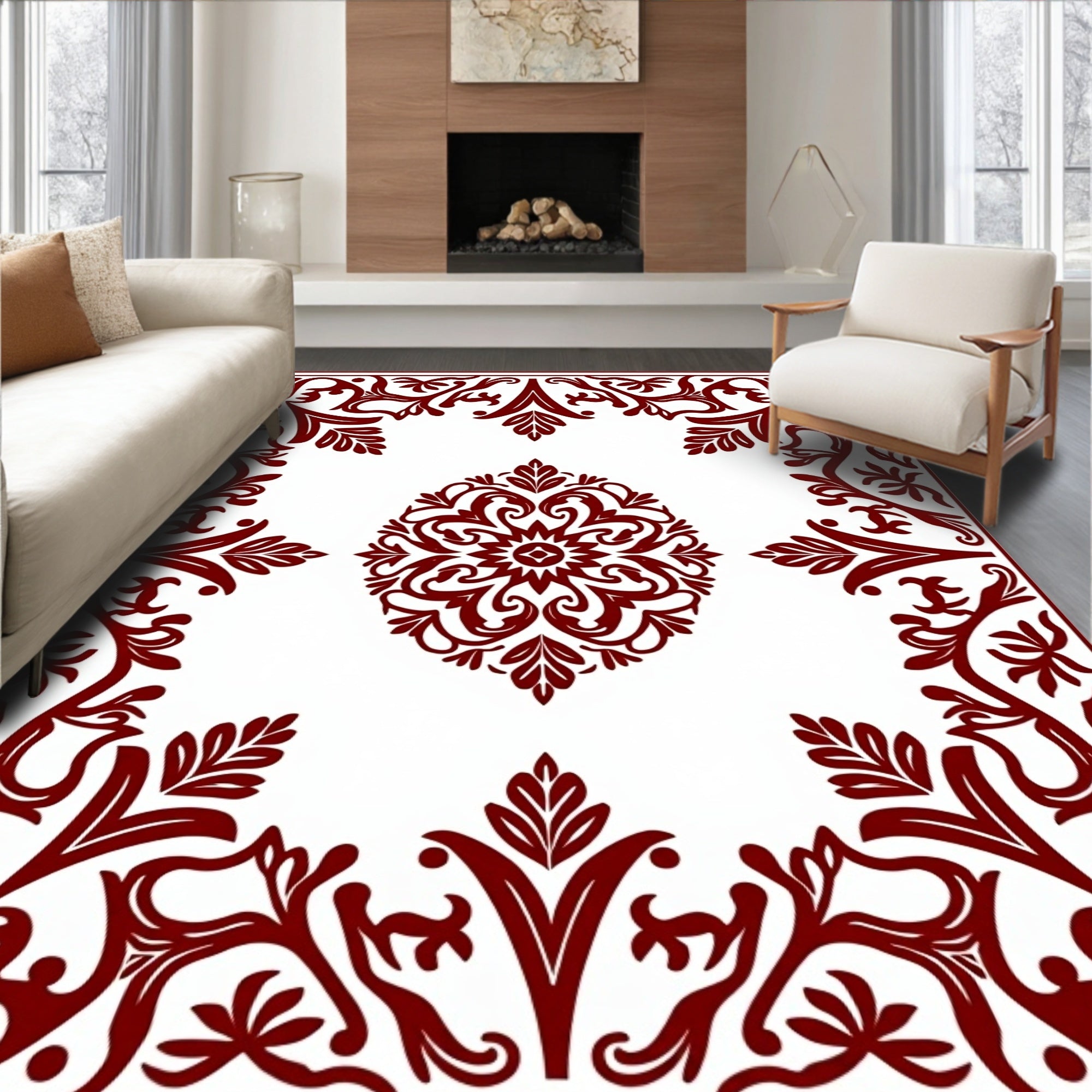 Flatwoven High Traffic Area Rug, Classic Damask Vinework with Floral Embellishments, Non Slip, Stain Resistant, Washable Area Rugs for Living Room, Bedroom (Red) Overview: