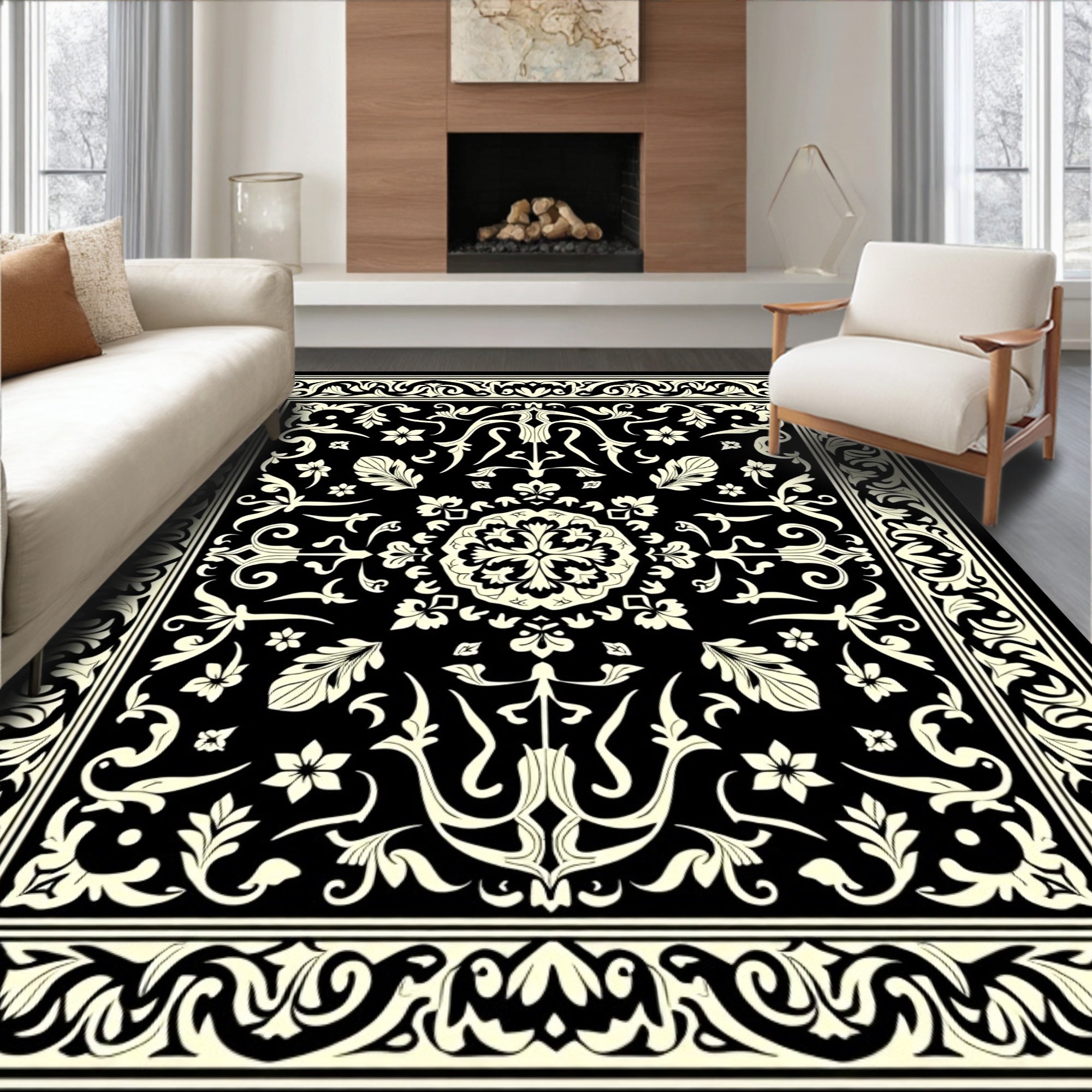 Flatwoven High Traffic Area Rug, Classic Rococo Scrollwork with Faded Petal Flourish Accents, Non Slip, Stain Resistant, Washable Area Rugs for Living Room, Bedroom (Black) Overview: