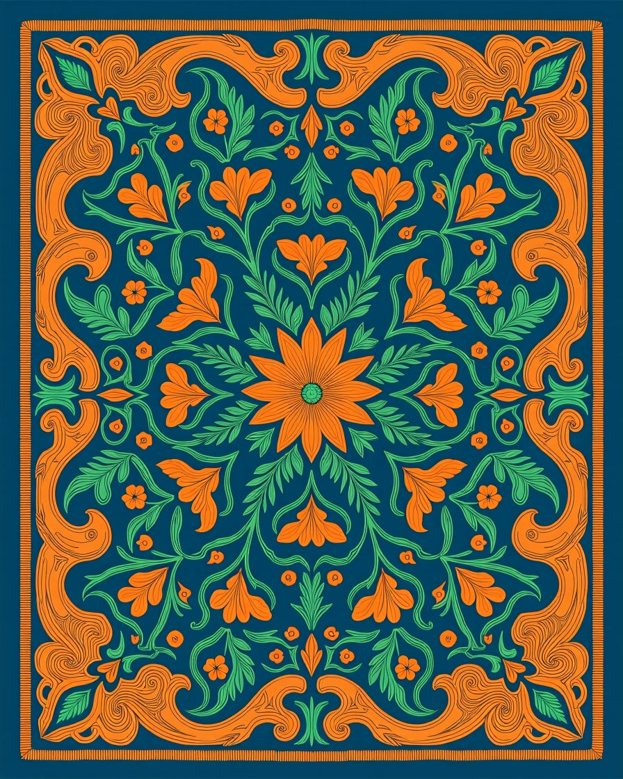 Elegant Victorian Floral Scroll with Detailed Leaf and Flower Accents (Blue)