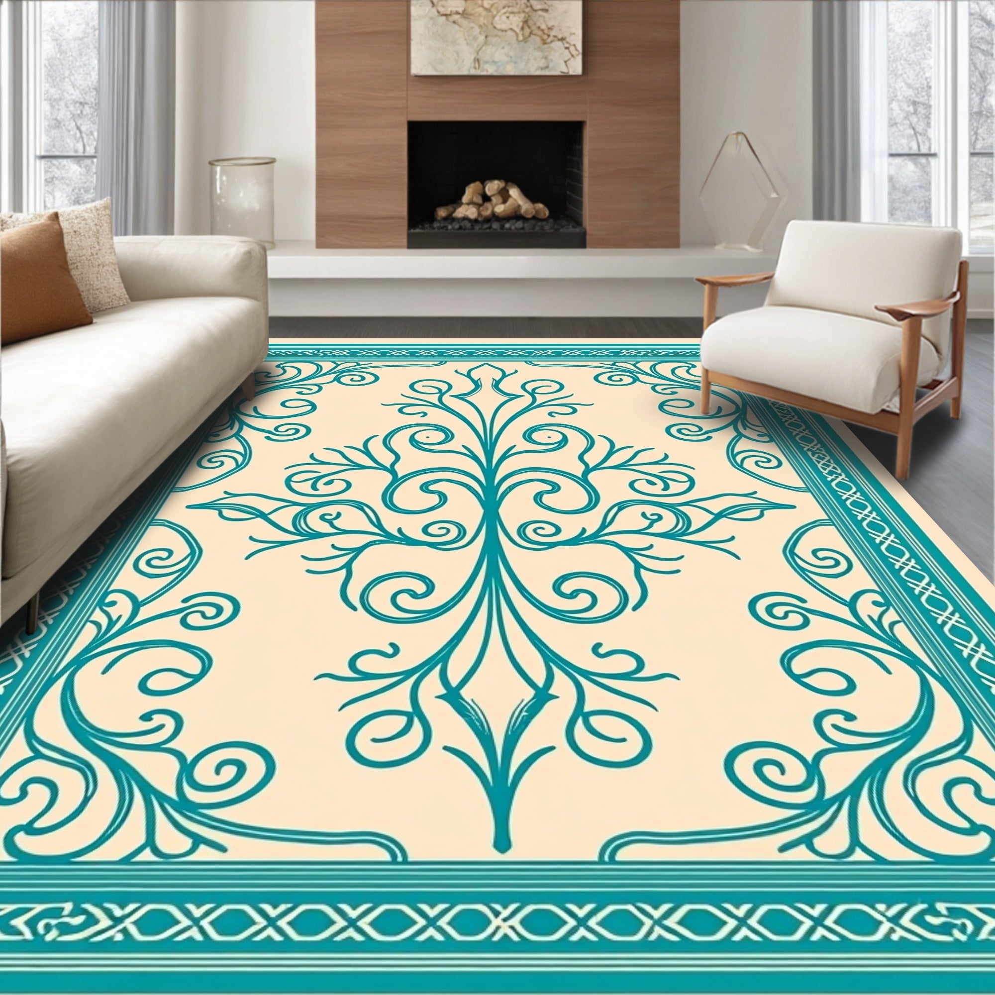 Flatwoven High Traffic Area Rug, Elegant Vine Scroll Lattice Traditional Decorative Surface, Non Slip, Stain Resistant, Washable Area Rugs for Living Room, Bedroom (Teal) Overview:
