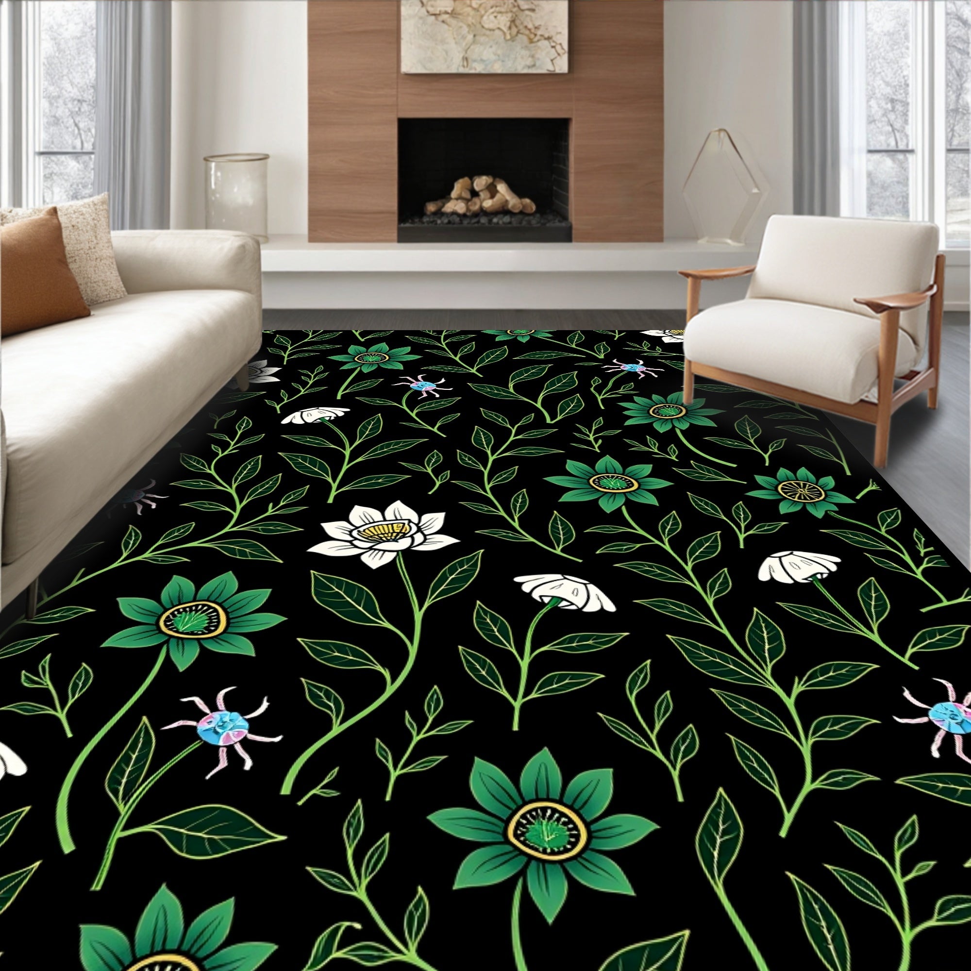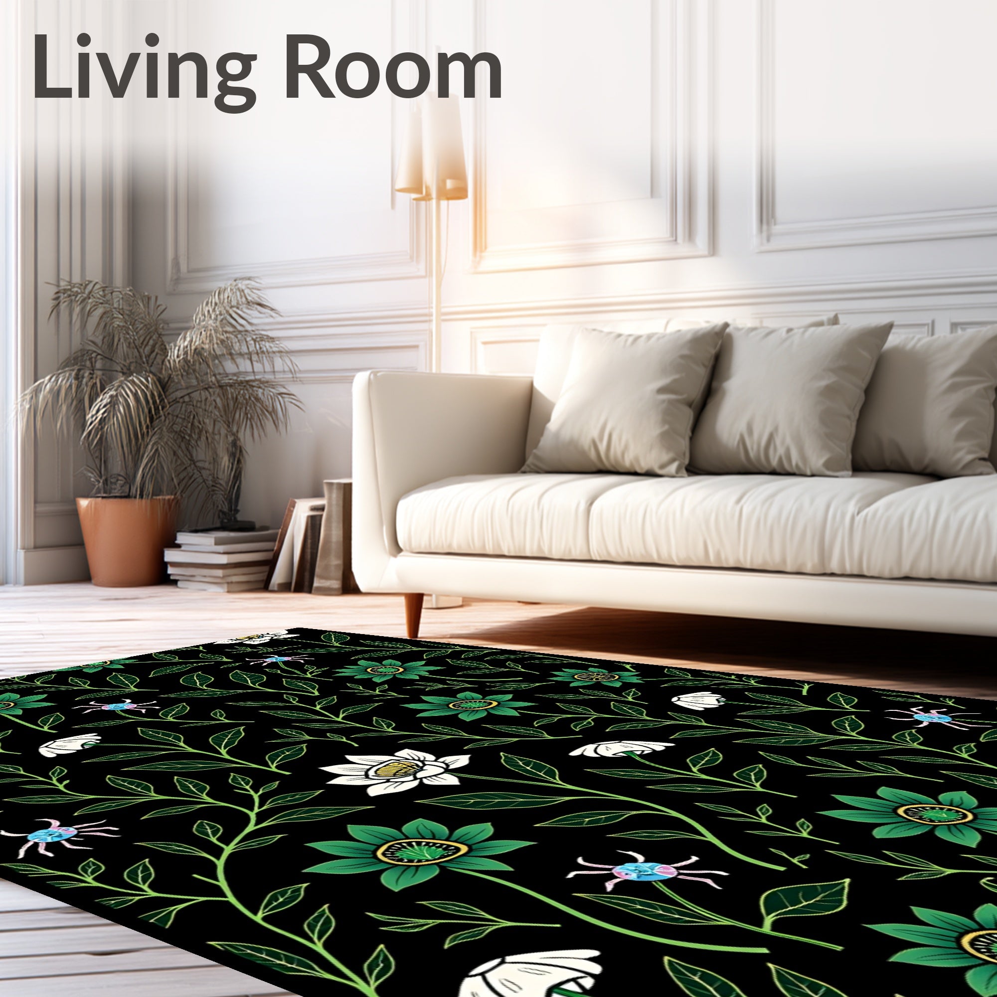 Flatwoven High Traffic Area Rug, Enchanted Jungle Lotus and Mushroom with Beetle Accents, Non Slip, Stain Resistant, Washable Area Rugs for Living Room, Bedroom (Black) Overview: