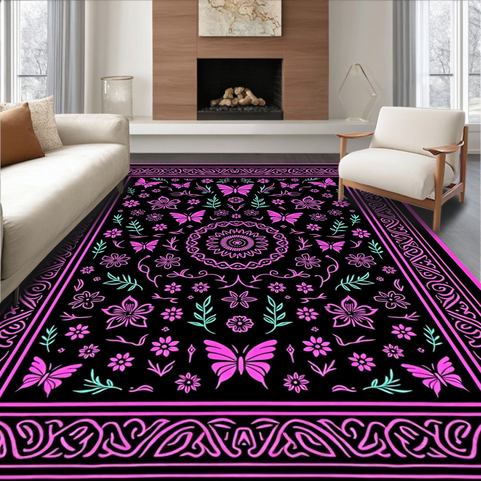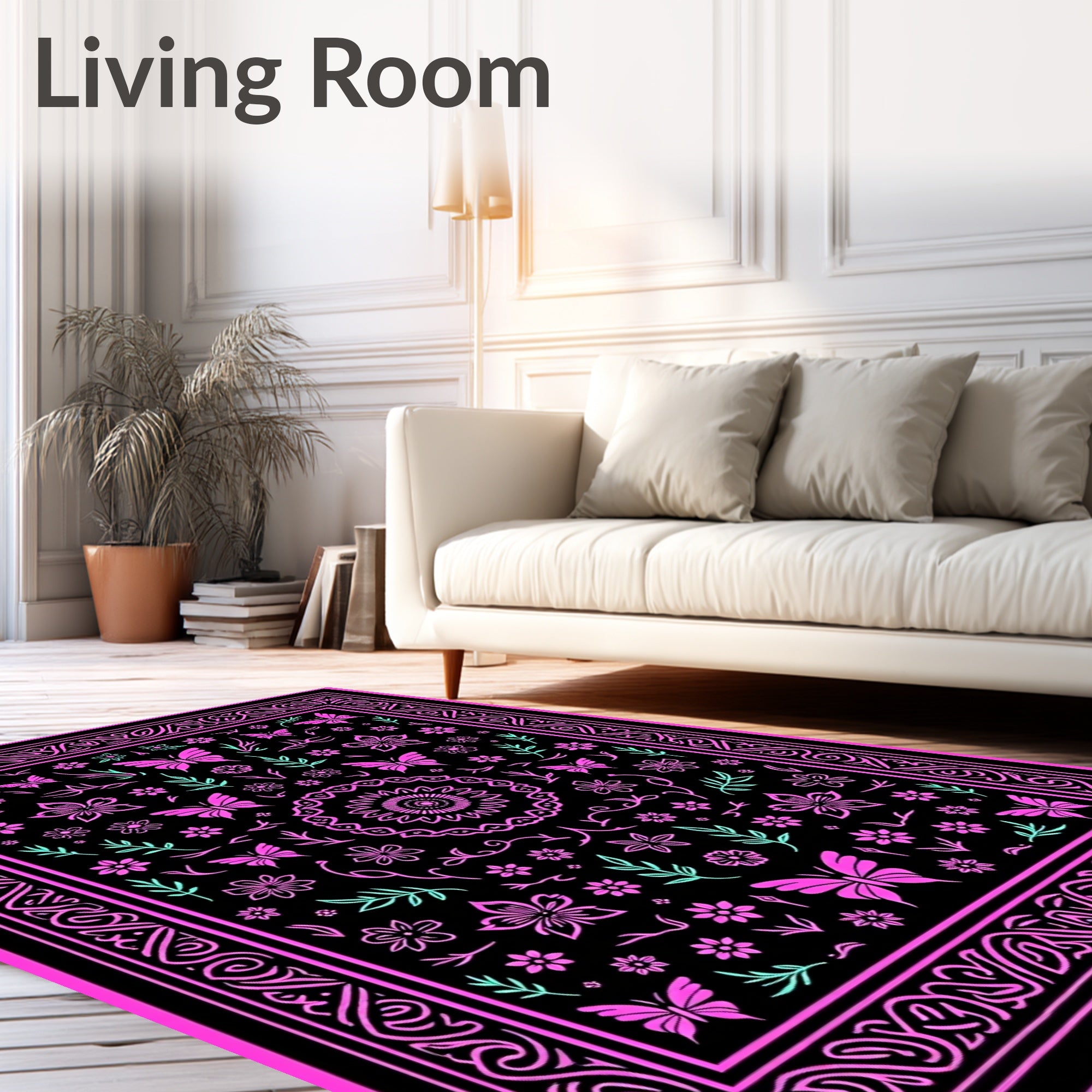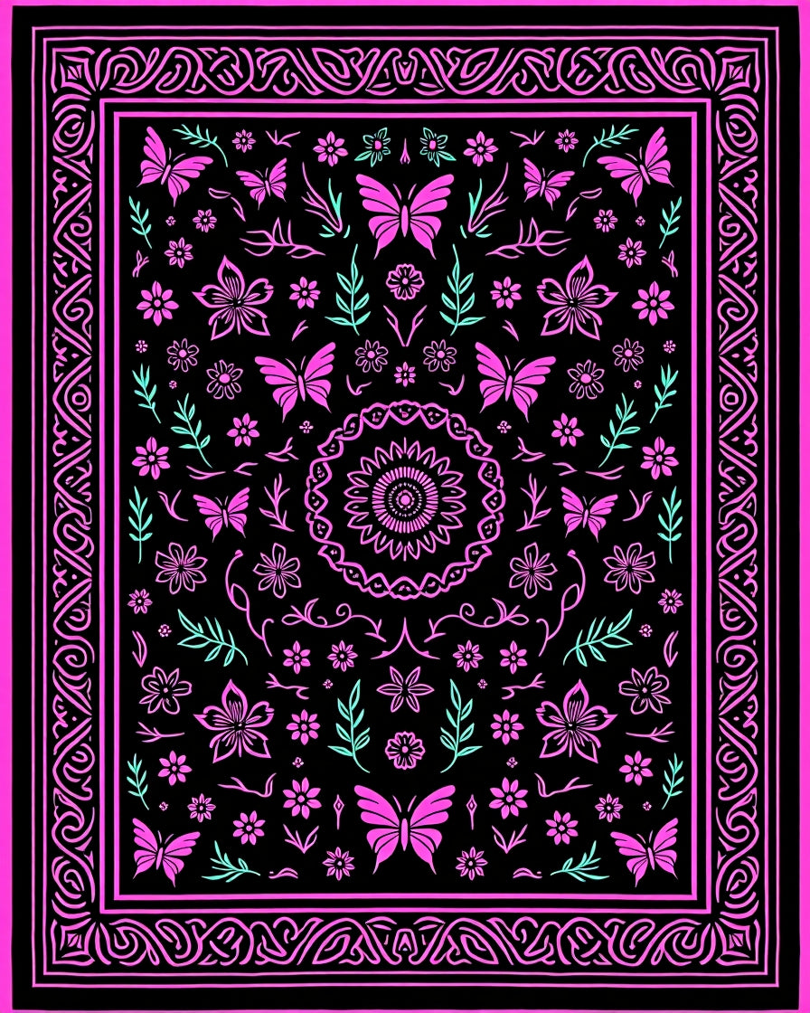 Flatwoven High Traffic Area Rug, Enchanting with Dark Floral Accents and Intricate Insect Motifs, Non Slip, Stain Resistant, Washable Area Rugs for Living Room, Bedroom (Pink) Overview: