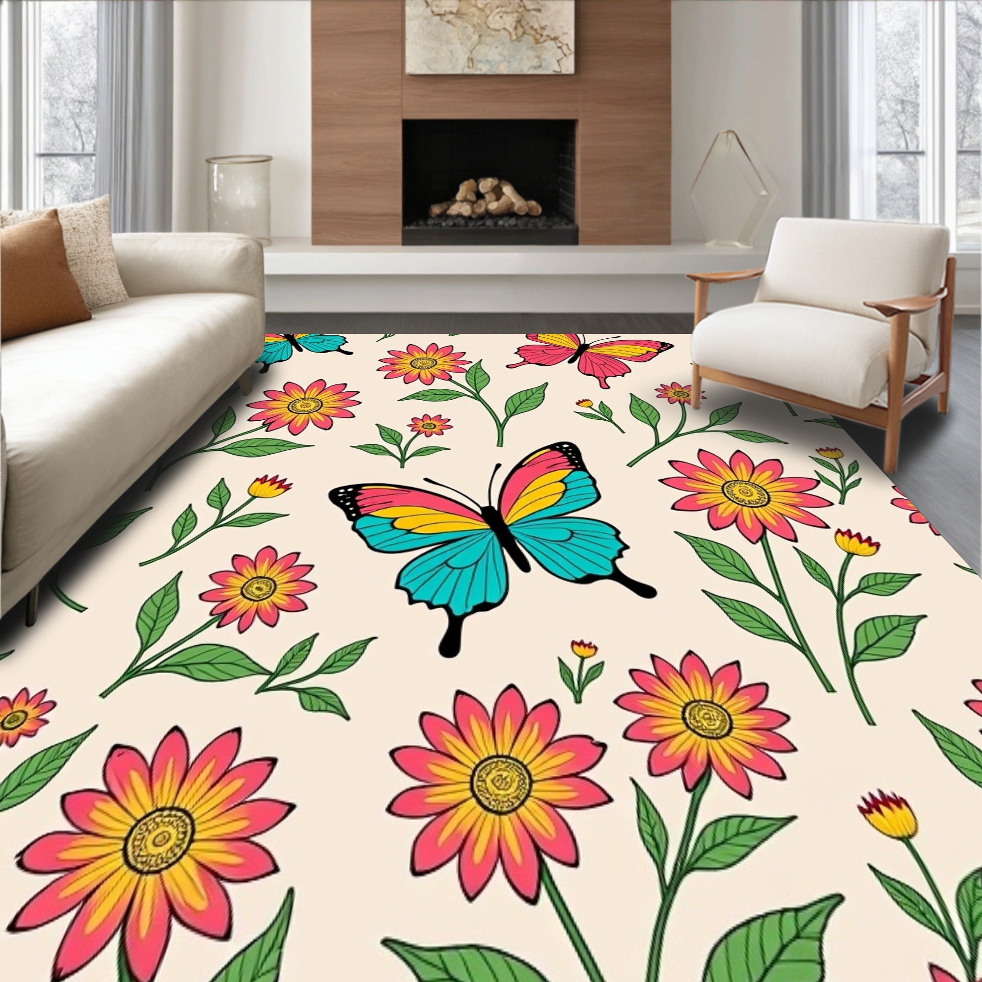 Flatwoven High Traffic Area Rug, Garden with Floral Meadow Motifs Floor Covering, Non Slip, Stain Resistant, Washable Area Rugs for Living Room, Bedroom (Pink) Overview: