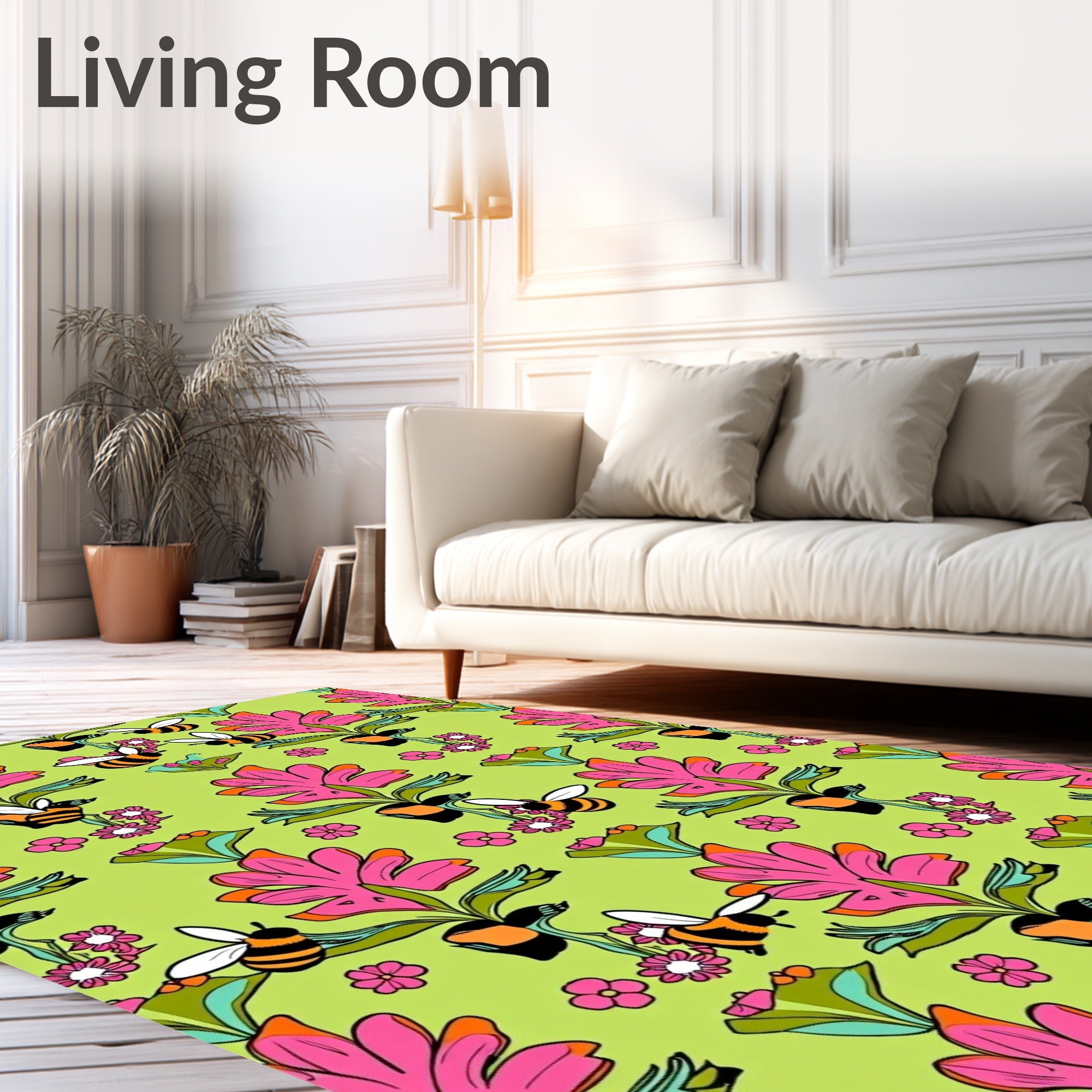 Flatwoven High Traffic Area Rug, Honeybee Wildflower Festival with Pollinator Theme, Non Slip, Stain Resistant, Washable Area Rugs for Living Room, Bedroom (Green) Overview: