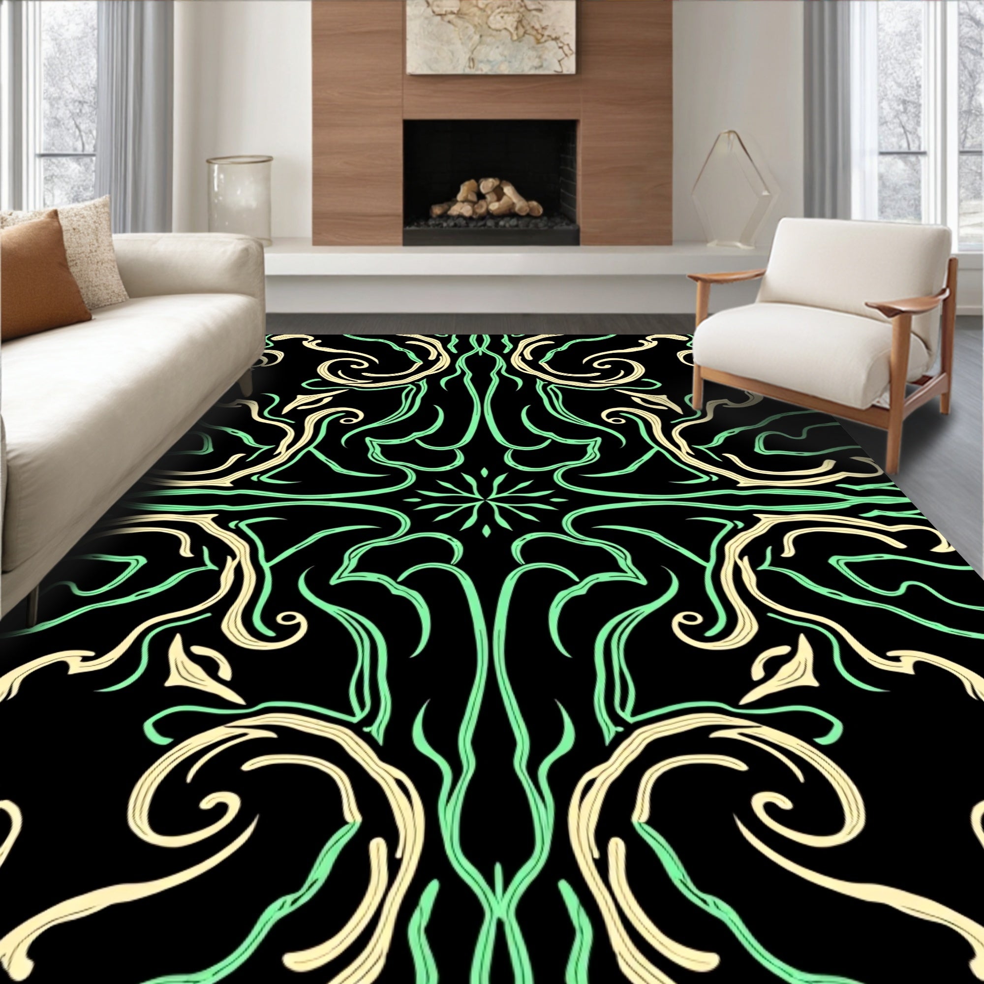 Flatwoven High Traffic Area Rug, Lush Wave With Interlocking Swirls And Gold Highlights, Non Slip, Stain Resistant, Washable Area Rugs for Living Room, Bedroom (Black) Overview: