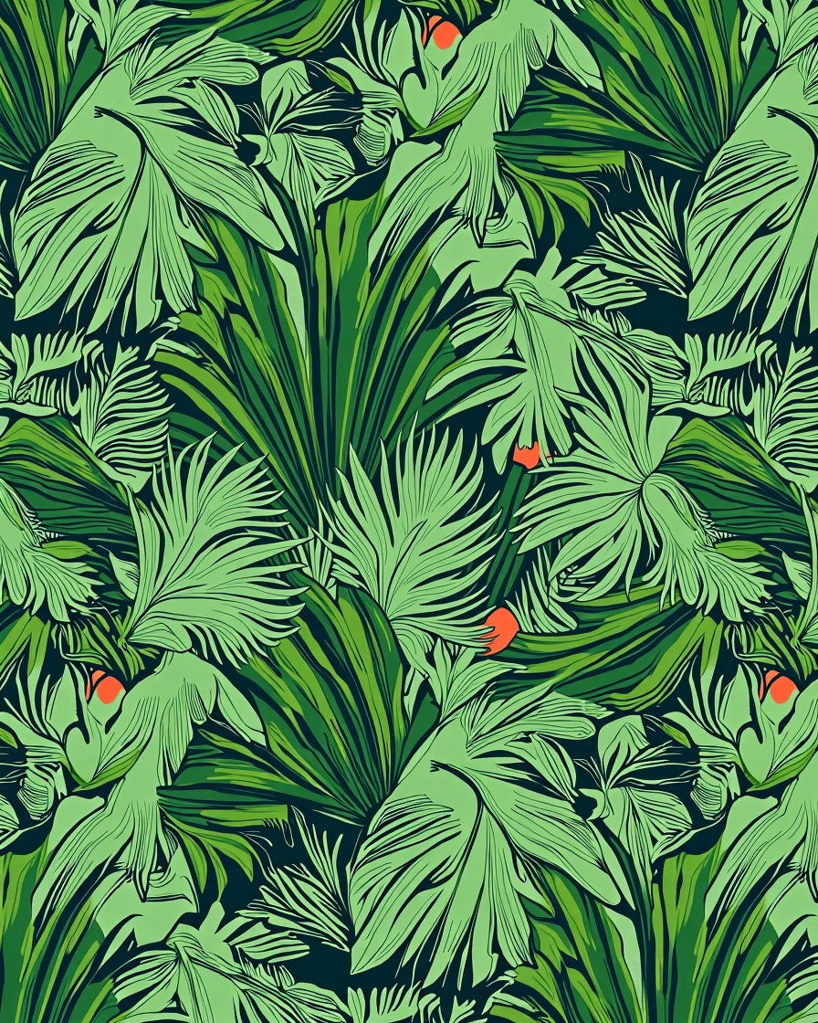 Rooted in the lush lineage of Neo-Tropical Modernism, this design is a visual ode to the maximalist greenery of Brazil’s midcentury landscape architecture. It draws inspiration from the legendary botanical tapestries of Roberto Burle Marx, where wild flora is reimagined as bold, graphic art. Verdant fronds fan out like emerald sunbursts, layered in a rhythmic dance of light-soaked lime and ink-dark forest shadows. Beneath the rhythmic canopy, small coral accents flicker like hidden exotic blooms in a hushed, primeval glade. When placed in a room, the atmosphere undergoes a sudden metamorphosis: urban walls seem to breathe, concrete floors dissolve into forest floor duff, and the hum of the city is replaced by an imagined tropical rain. It is designed for the soul-led homebuilder who seeks refuge in the organic—the one who believes a home should be an sanctuary of growth and boundless vitality. Walk upon this verdant scene and let the room soften around you. Don't just decorate; cultivate an interior wilderness.